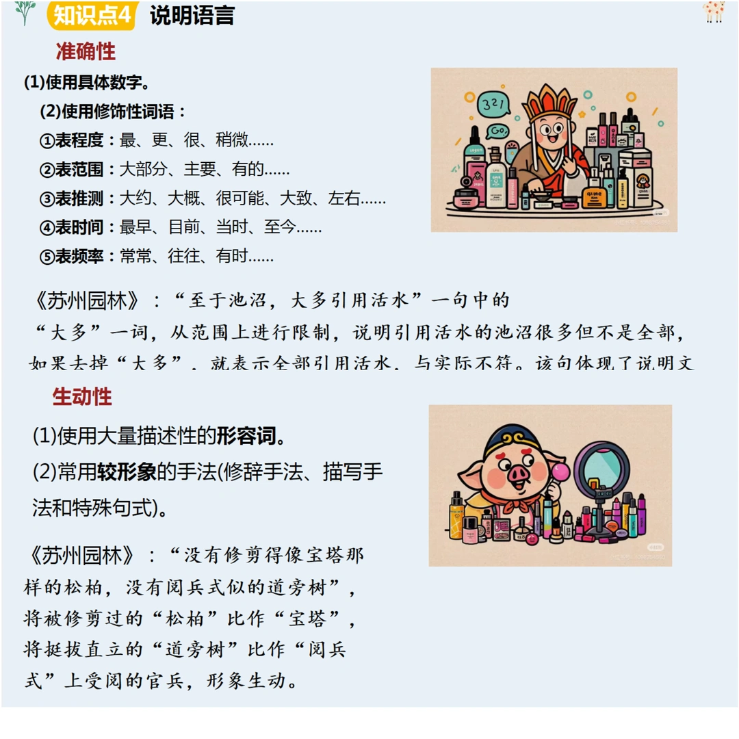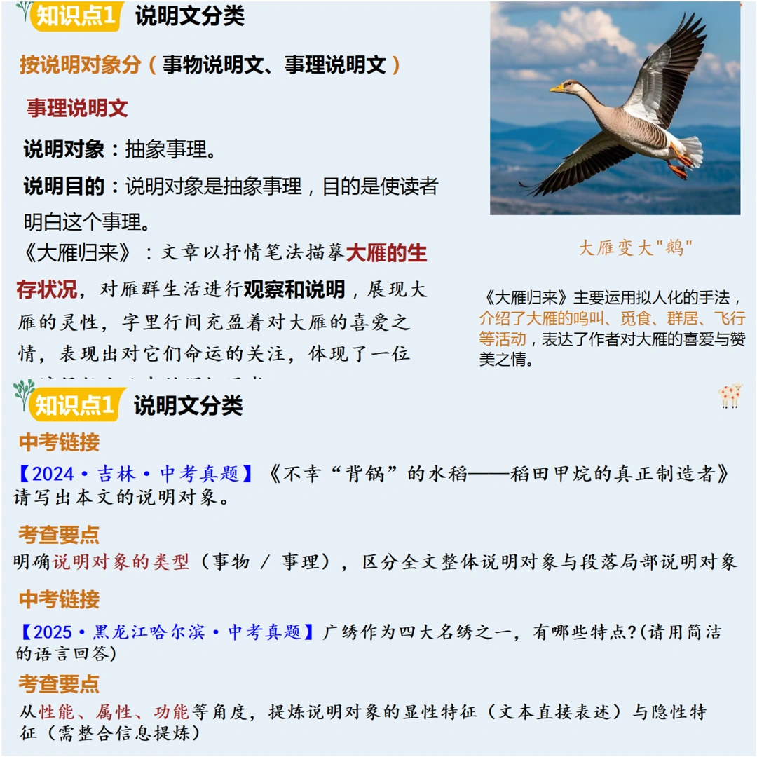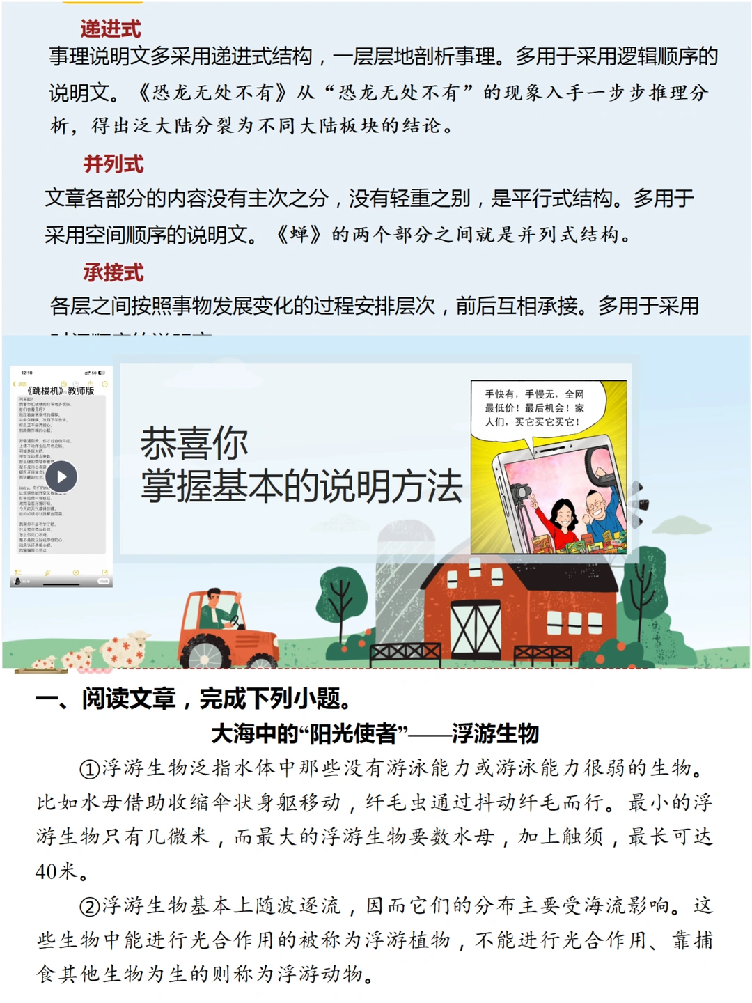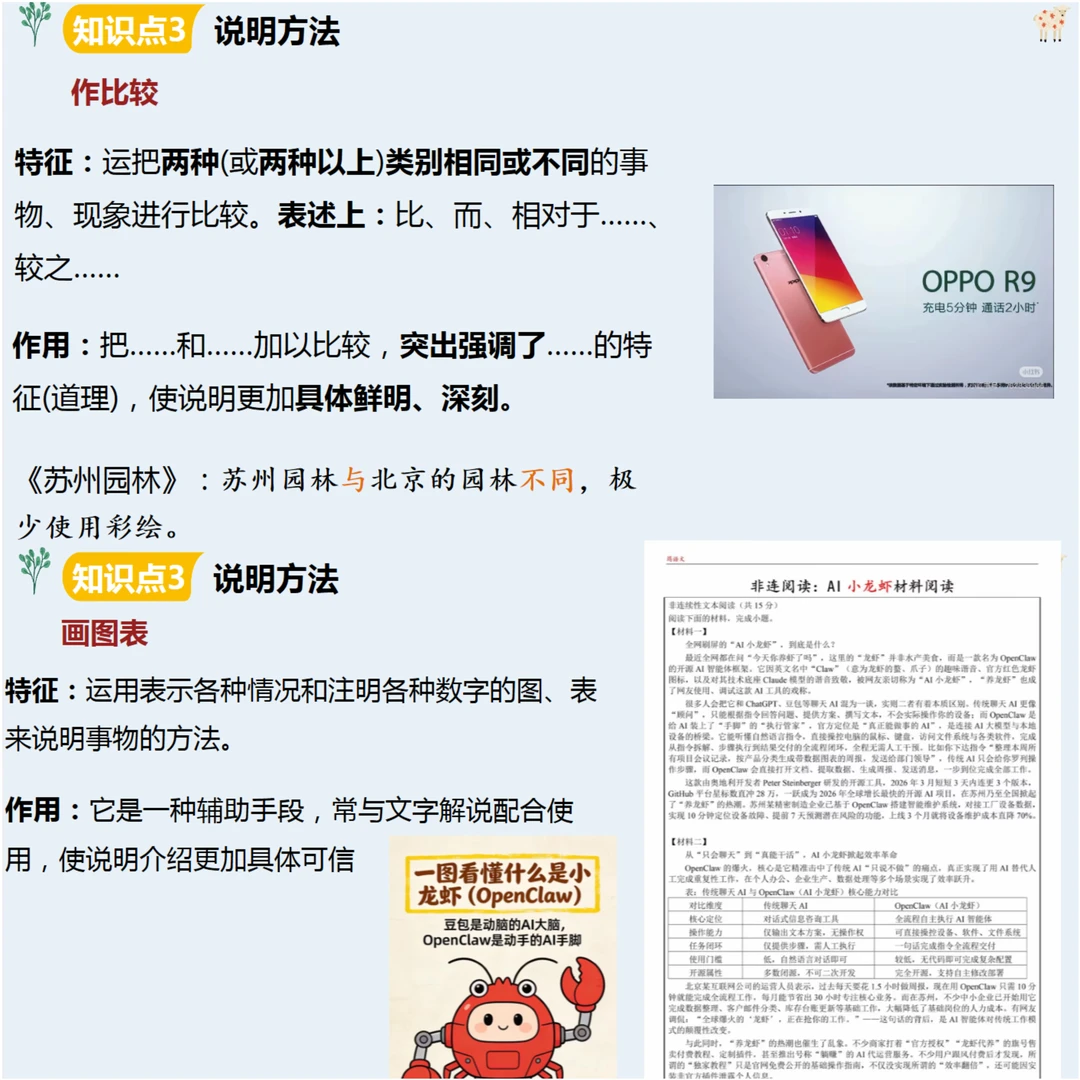当久了老师是会有点不正常的,言归正传,马上过完第一轮基础知识复习了(字音字形、成语运用、句子成分、病句修改、语言的简明连贯、语言的得体、标点符号、综合性学习)终于要到阅读了,先复习非文学文本阅读/非连续性文本阅读,在选择题或者简答题里面会涉及说明文知识,特别是有些地区直接考查一个四分简答题吗。学生基础差,你让他们自学是没用的,所以在课上一起梳理说明文分类、说明文顺序、说明方法、说明文语言、说明文结构等知识点,最重要的是要进行练习!以练代讲在复习里是比较高效的。