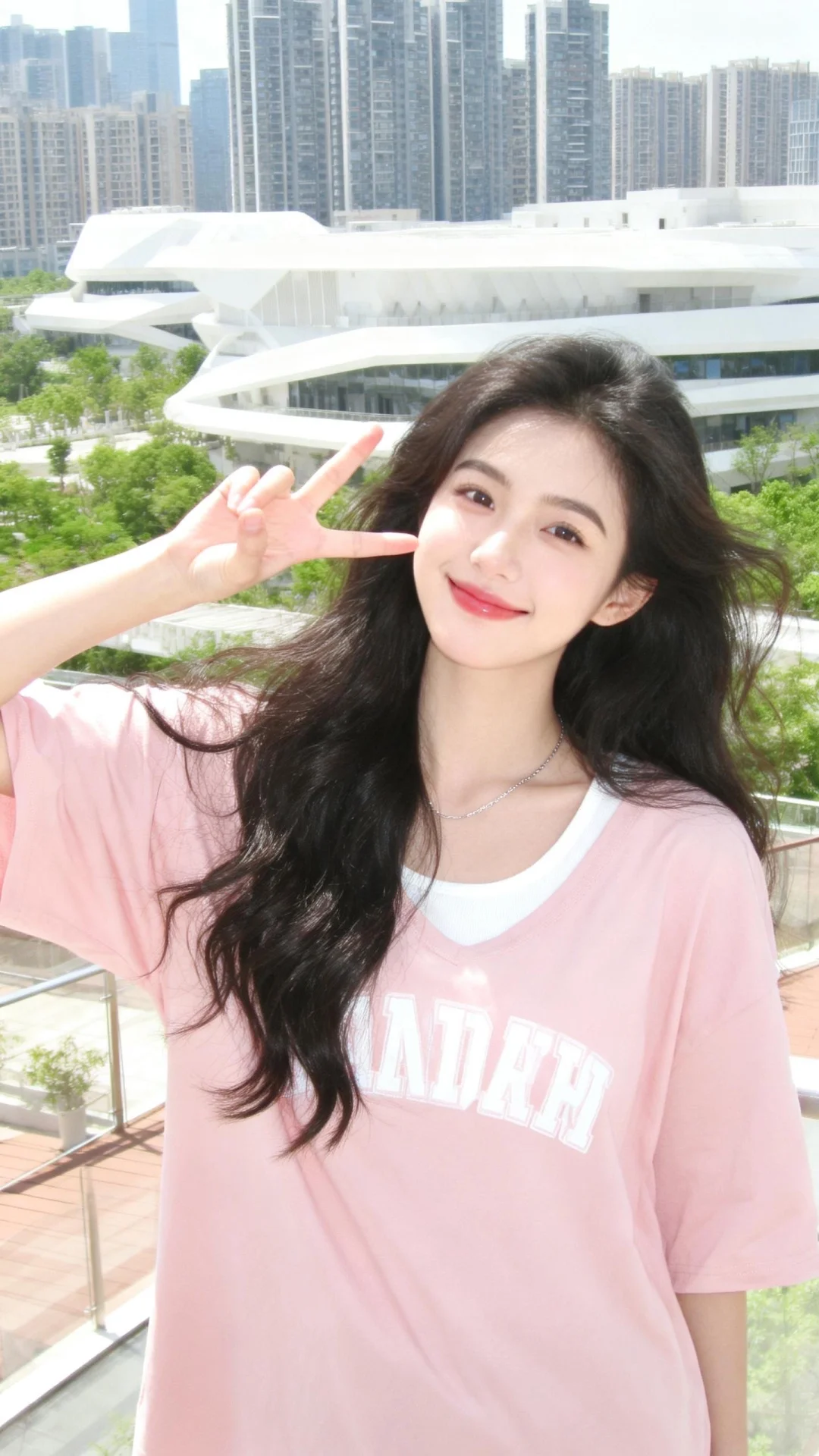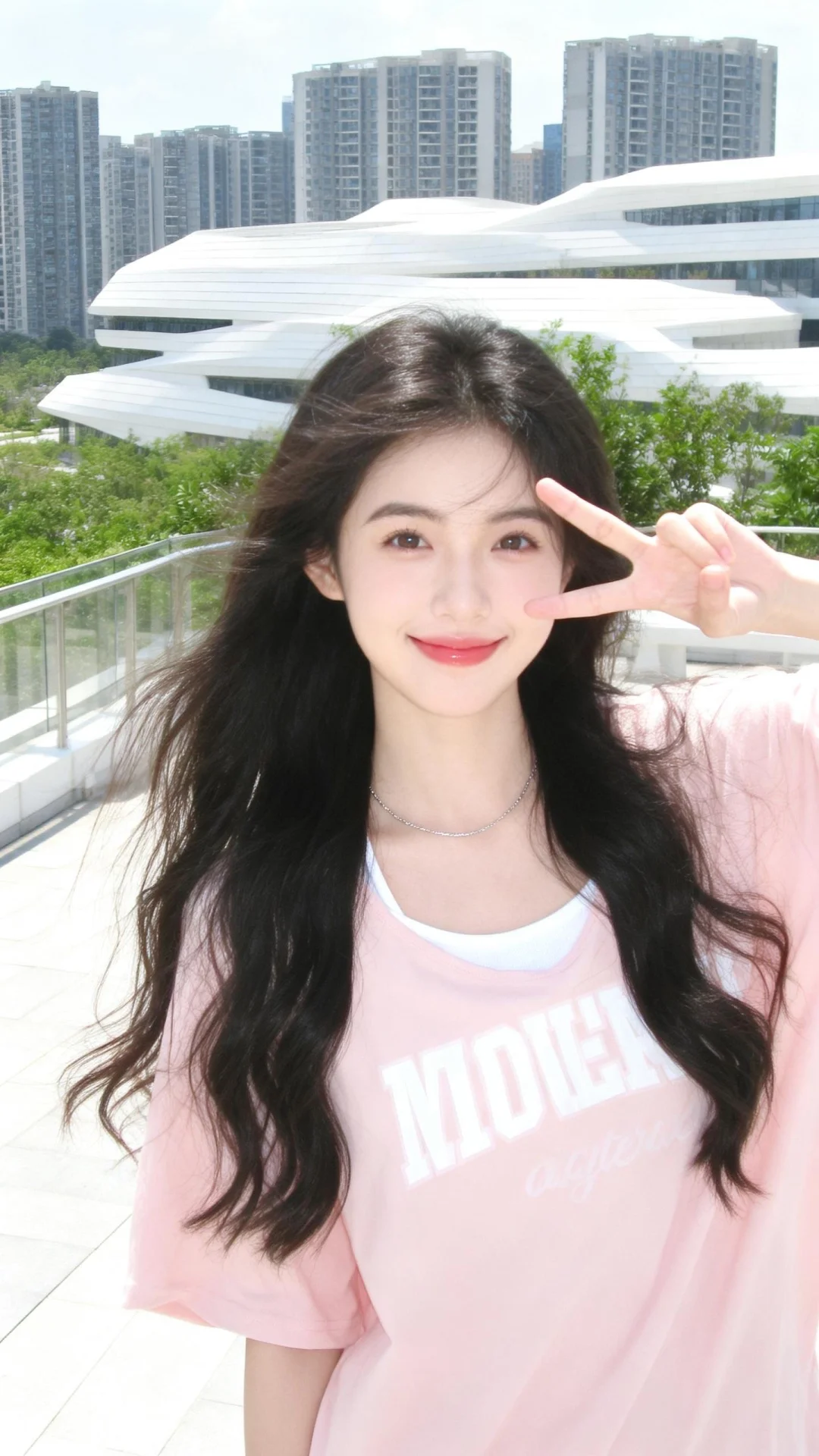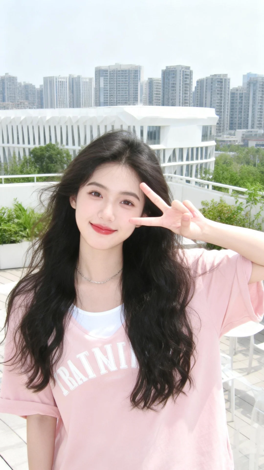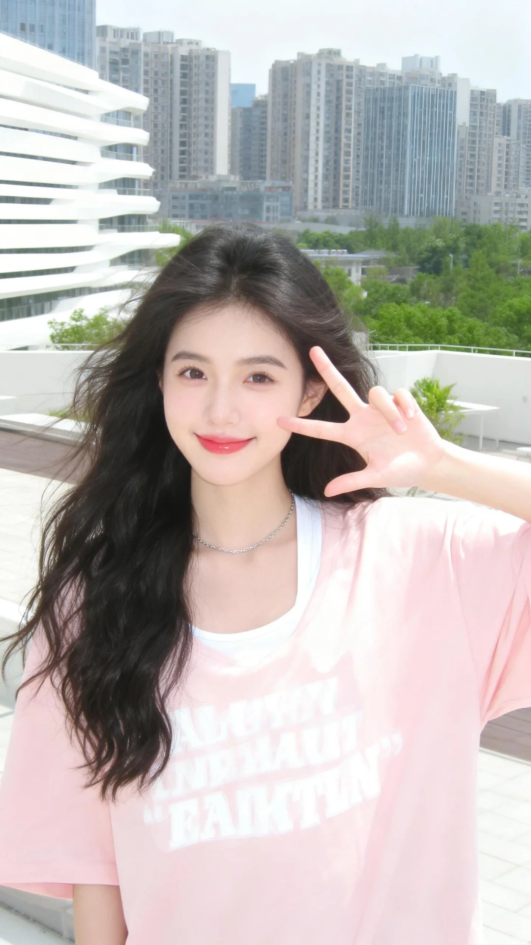 以日系清新、具有DV质感低分辨率且略带轻微曝光的视觉风格呈现。画面主体是一位冷白皮女生,她拥有乌黑的长卷发自然垂落,发丝显得轻盈灵动。她妆容清透,唇色自然,眉眼十分精致,嘴角微微上扬,右手比出可爱的手势,神态灵动又活泼。女生身着一件浅粉色的短袖上衣,上面带有白色英文字母印花,面料柔软亲肤,版型宽松舒适,内搭简约。颈间佩戴着一条细款银色细链,为整体增添了精致感。背景是户外的城市露台场景,远处能够看到现代化的高楼建筑群,线条利落的白色建筑与葱郁的绿植相互映衬。阳光明媚,光线通透柔和,整体氛围清新元气,充满了活力满满的少女感,色调明亮温暖,尽显轻松甜美的日常氛围,同时还超级有网感。