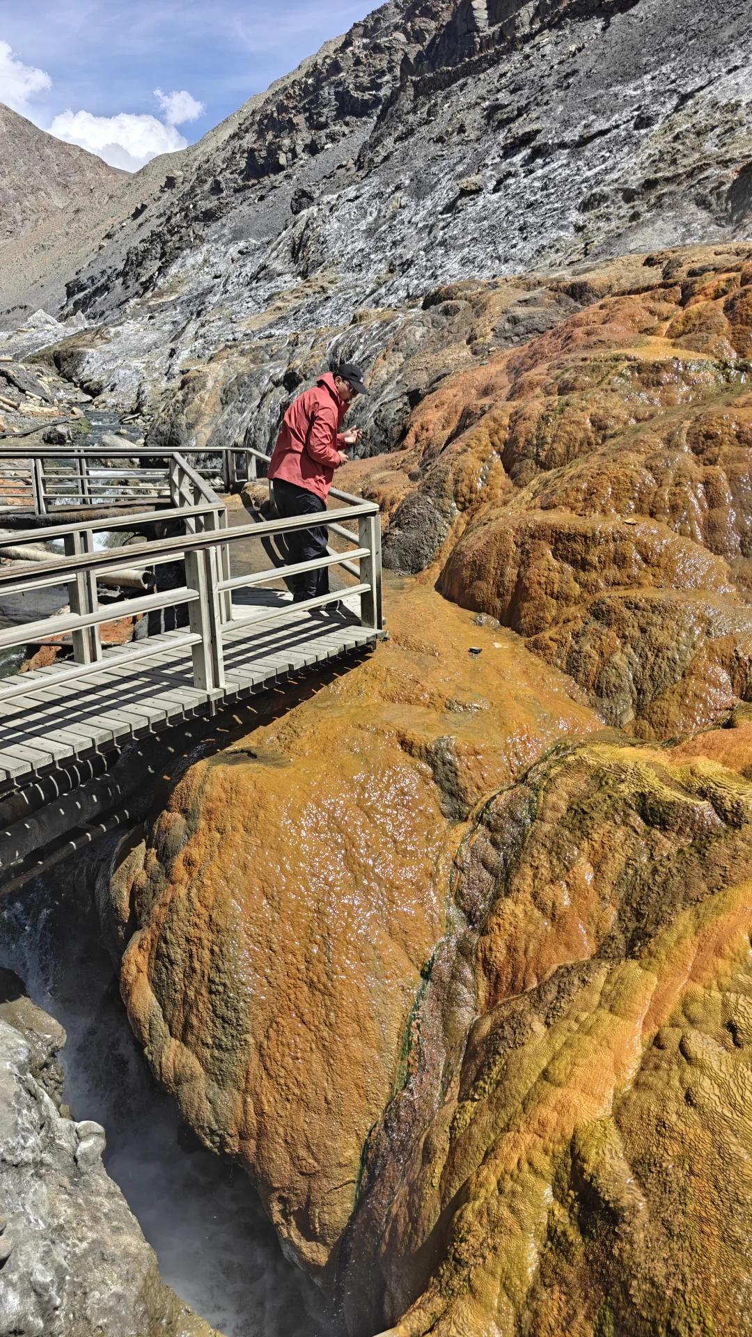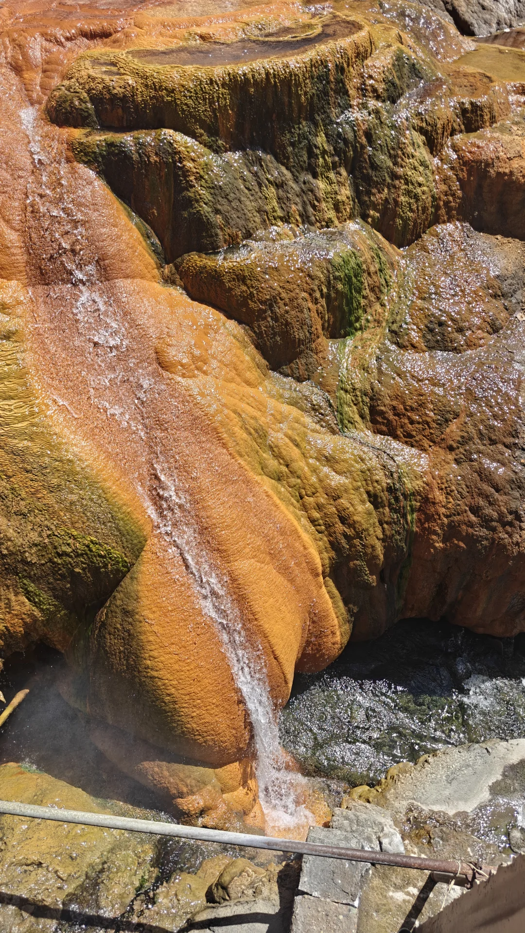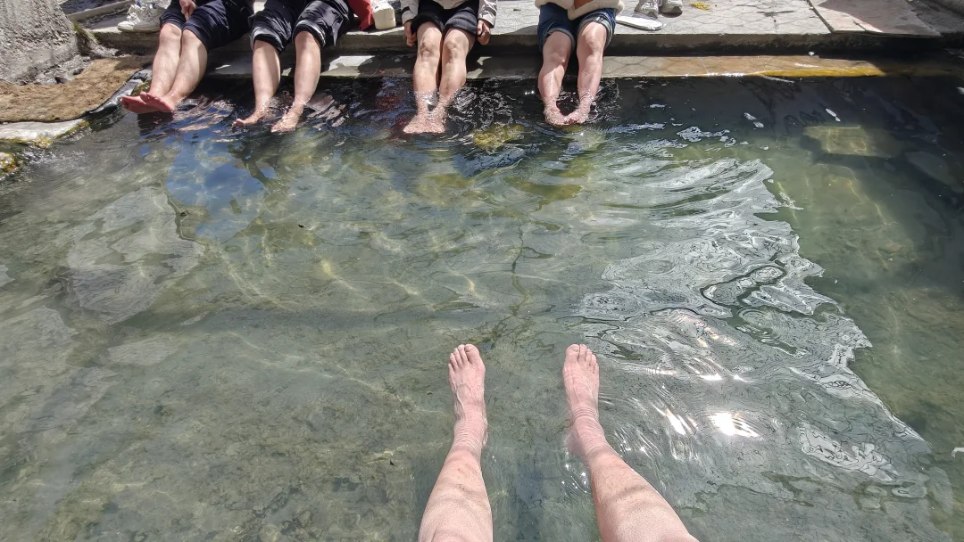 酒店大门口自觉缴费(外地人30,本地人10)就可以随意享受室内室外两种不同的温泉体验。先去室外,沿着土路向上开,没有人工池壁,只有简单的观赏栈道。泉水流经的岩石被硫磺染成斑斓的金黄色,泉华台层层叠叠如梯田,仿佛外星地貌。 雪山融水与热泉共聚一沟,调和成适合的温度,你变可以选择放松一入,温泉富含氟、硫、硅酸等矿物质,当地人笑称“泡一次能顶三贴膏药”,尤其适合缓解高原徒步后的疲惫。沟里可以泡脚,沟边也搭建了许多简易的泡池,或露天或篷壁,因人而异,大方或害羞都有自己的归属。