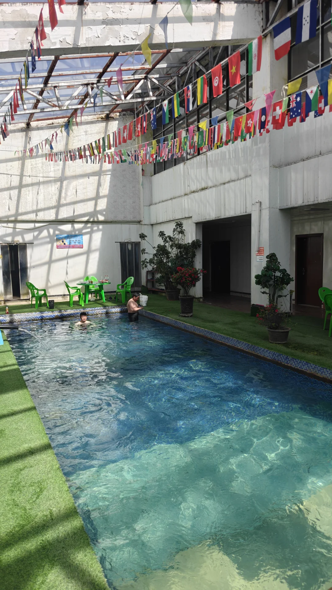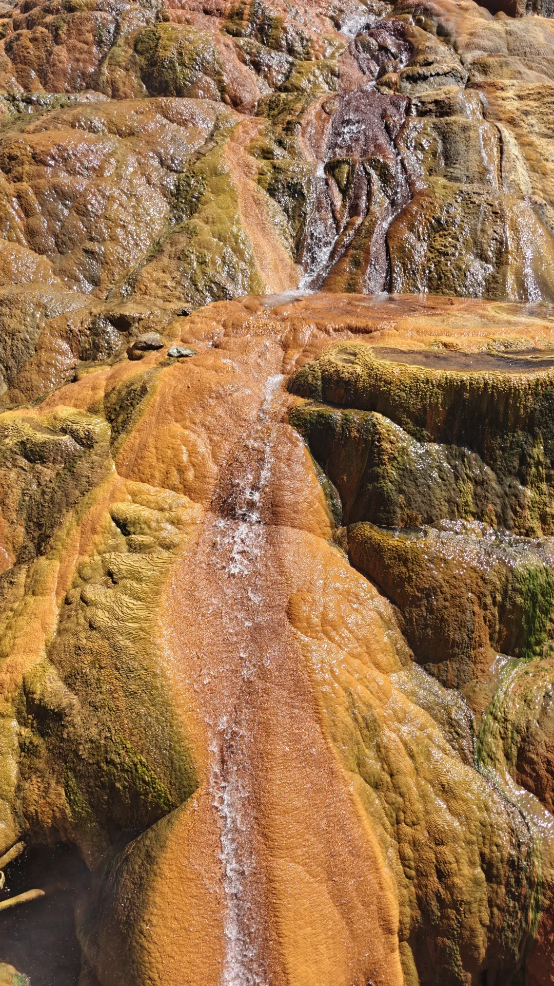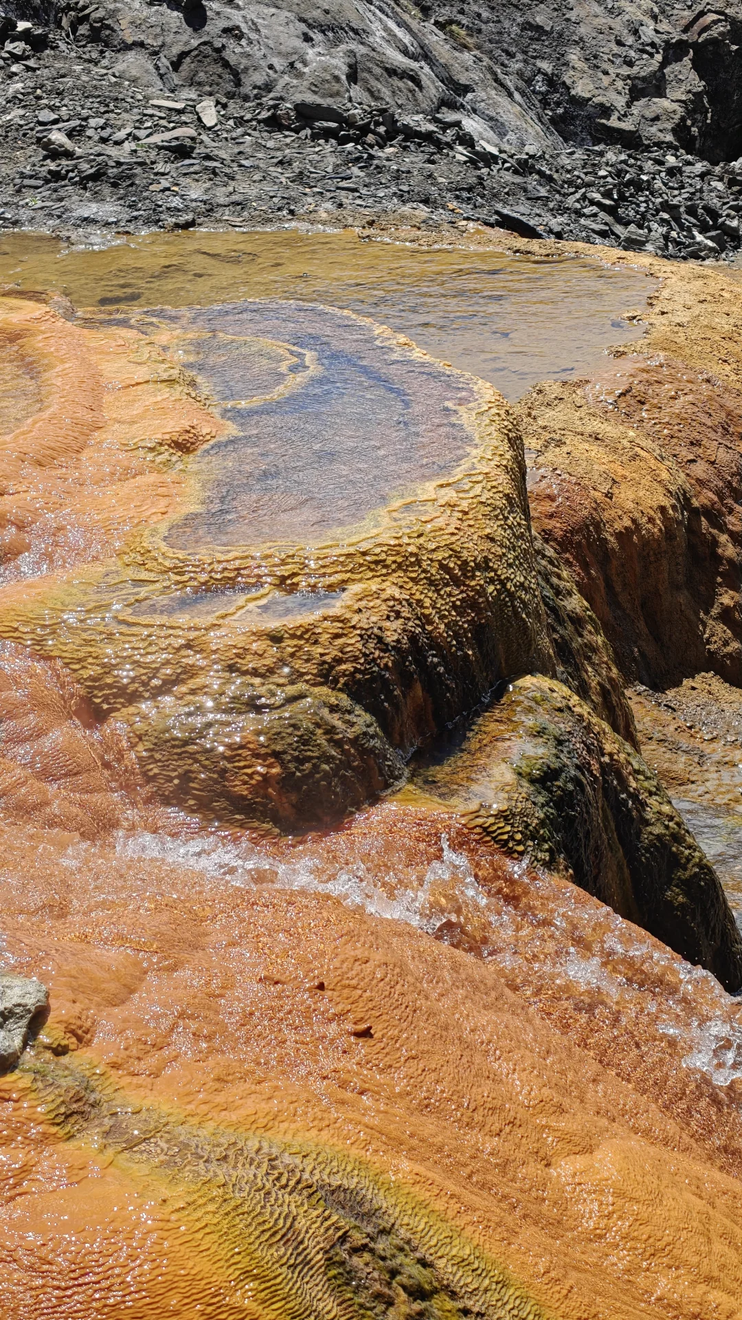 酒店大门口自觉缴费(外地人30,本地人10)就可以随意享受室内室外两种不同的温泉体验。先去室外,沿着土路向上开,没有人工池壁,只有简单的观赏栈道。泉水流经的岩石被硫磺染成斑斓的金黄色,泉华台层层叠叠如梯田,仿佛外星地貌。 雪山融水与热泉共聚一沟,调和成适合的温度,你变可以选择放松一入,温泉富含氟、硫、硅酸等矿物质,当地人笑称“泡一次能顶三贴膏药”,尤其适合缓解高原徒步后的疲惫。沟里可以泡脚,沟边也搭建了许多简易的泡池,或露天或篷壁,因人而异,大方或害羞都有自己的归属。