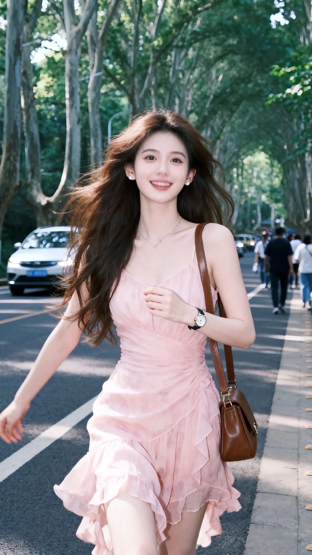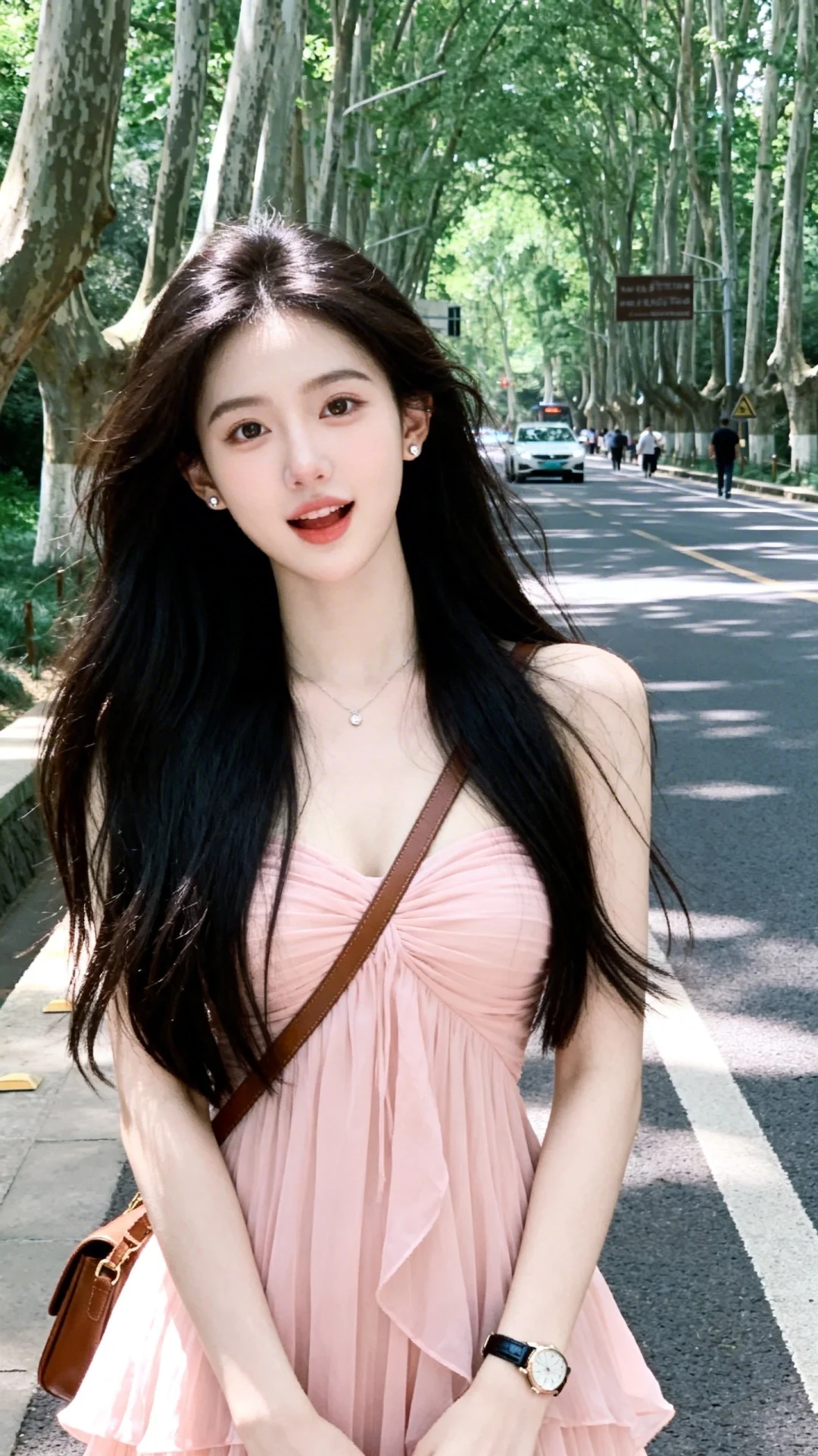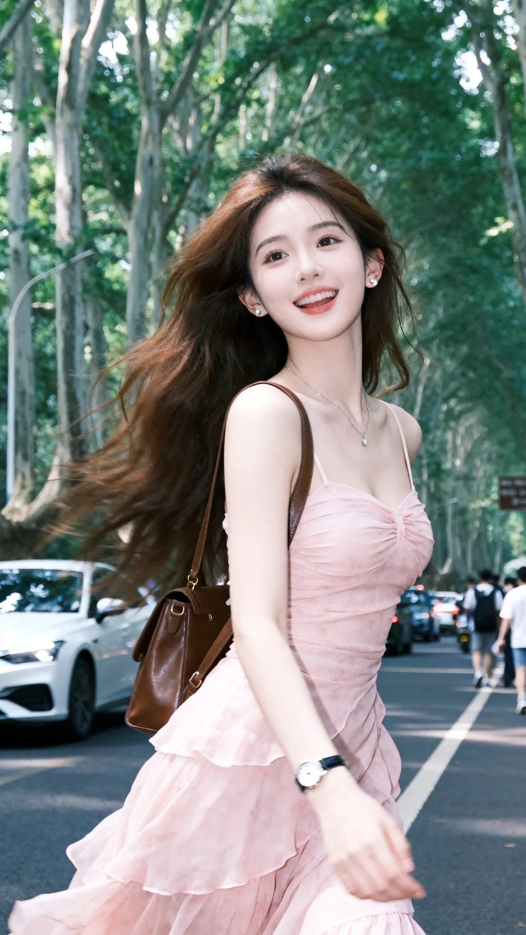 一位年轻美女,身穿浅粉色雪纺裙,s曲线身材,搭配棕色单肩包,整体造型时尚休闲且随性潮流,以自在随性的姿态被抓拍,展现出青春感和文艺范,洋溢着假期旅游的快乐,在夏日户外林荫道上,两旁树木高大,路上有车辆和行人,生活气息浓厚的街景,人像摄影,抓拍,青春文艺氛围,夏日清新风格。表情可爱黑长直深色长发系带束缚,年轻娇小,发丝呈现出自然的蓬松感与垂坠感,长发散落于肩头两侧,冷白皮气质美女,纯欲风,皮肤白皙,偶像气质,fairskin,光滑,水润质感,身材完美,背着包包,戴耳钉,戴手表,戴项链,做可爱表情,眉清目秀,初恋感,眼神很自然不失真,完美身材,皮肤质感白嫩清透,甜美女生,完美贴合身形;整体风格简约大气,又因修身剪裁,俏皮灵动,嫩白皙柔滑,氛围感,故事感,视觉冲击效果,高级感,动态感,32K,大师杰作。梦幻,冷白皮,必须身材完美,肌肤雪白有光泽。整体画面必须清新明亮干净。随机表情,随机的淡妆容,随机发型和颜色,随机的动作,随机的光影,随机角度,总体有很多的不确定性,但又好看,搭配又很合理,最高等级画质,CCD拍摄,情绪片,极简风,唯美迷人,优雅气质,偶像气质,高级感,三庭五眼,瓜子脸,清纯,展现冰瓷玉肌冷白皮绝世美人,近照,动作随机