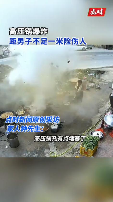 男子这时候离高压锅也就五六十公分,赶紧向后躲闪,但还是被洒上了一些汤汁,受了轻微的烫伤。