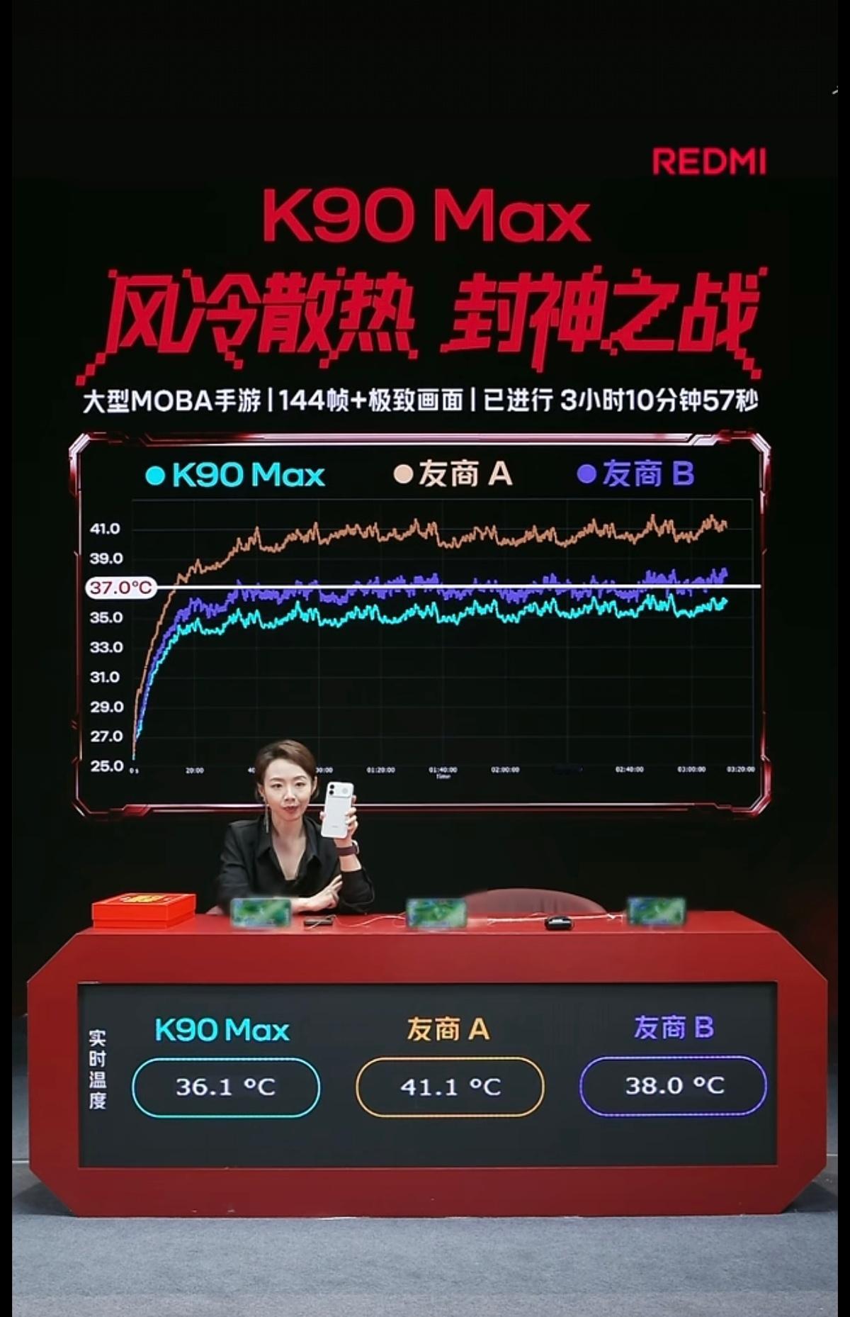 两个友商一个38℃,一个飞到了41.1℃,这个主动散热能力被REDMI爆杀了啊