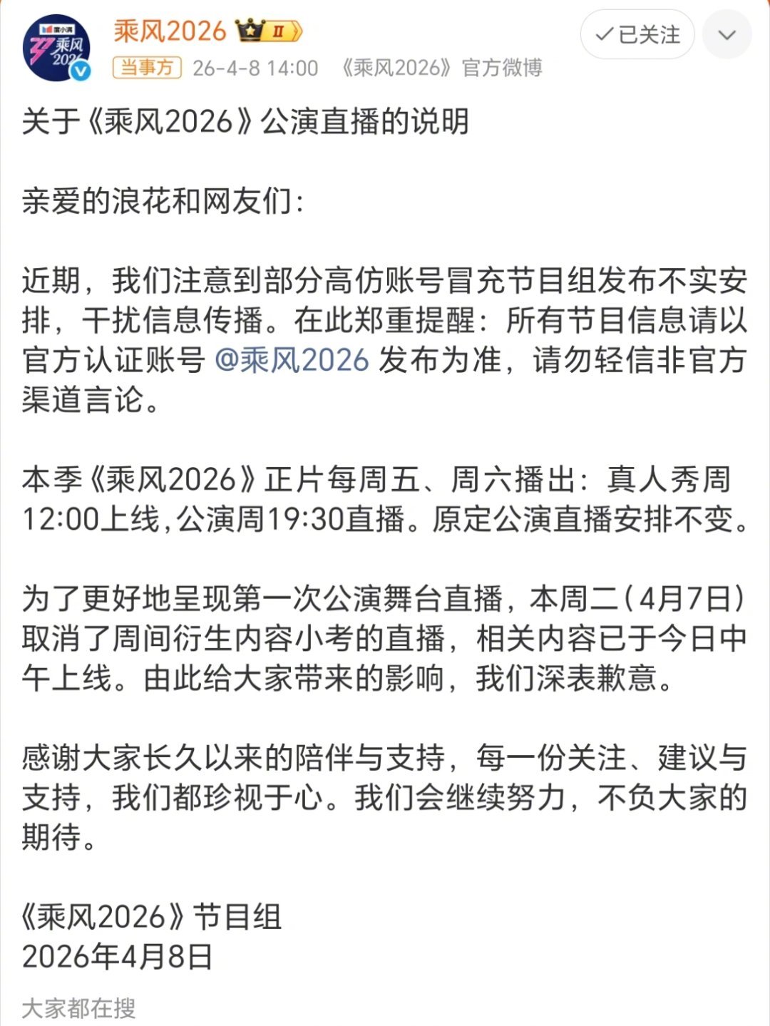 浪姐回应取消小考直播乘风2026 乘风2026回应,辟谣高仿账号散播的不实消息,
