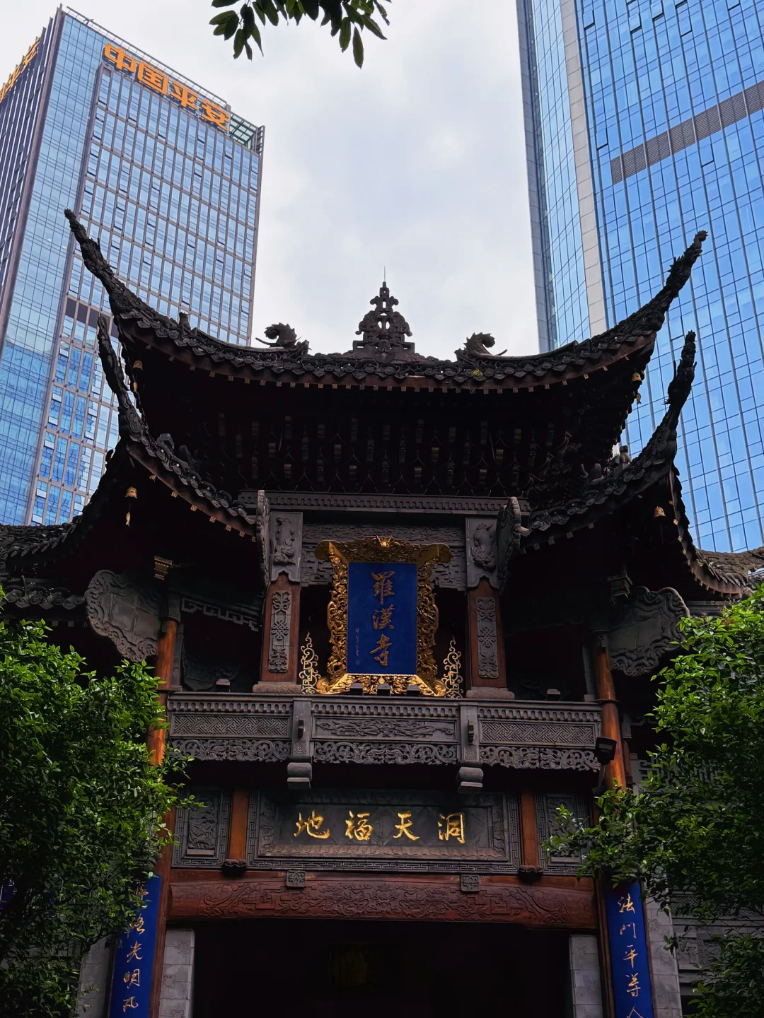 古代寺庙与现代城建的结合,很少能见到这样的场景,值得一看。顺路就可以走到解放碑打卡+吃饭。
