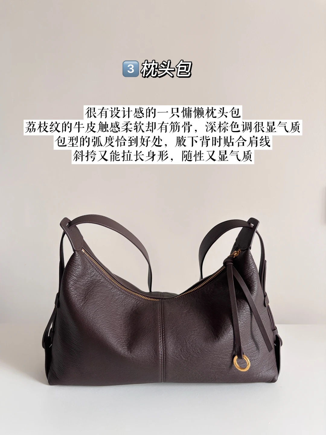 荔枝纹的牛皮触感柔软却有筋骨,深棕色调很显气质