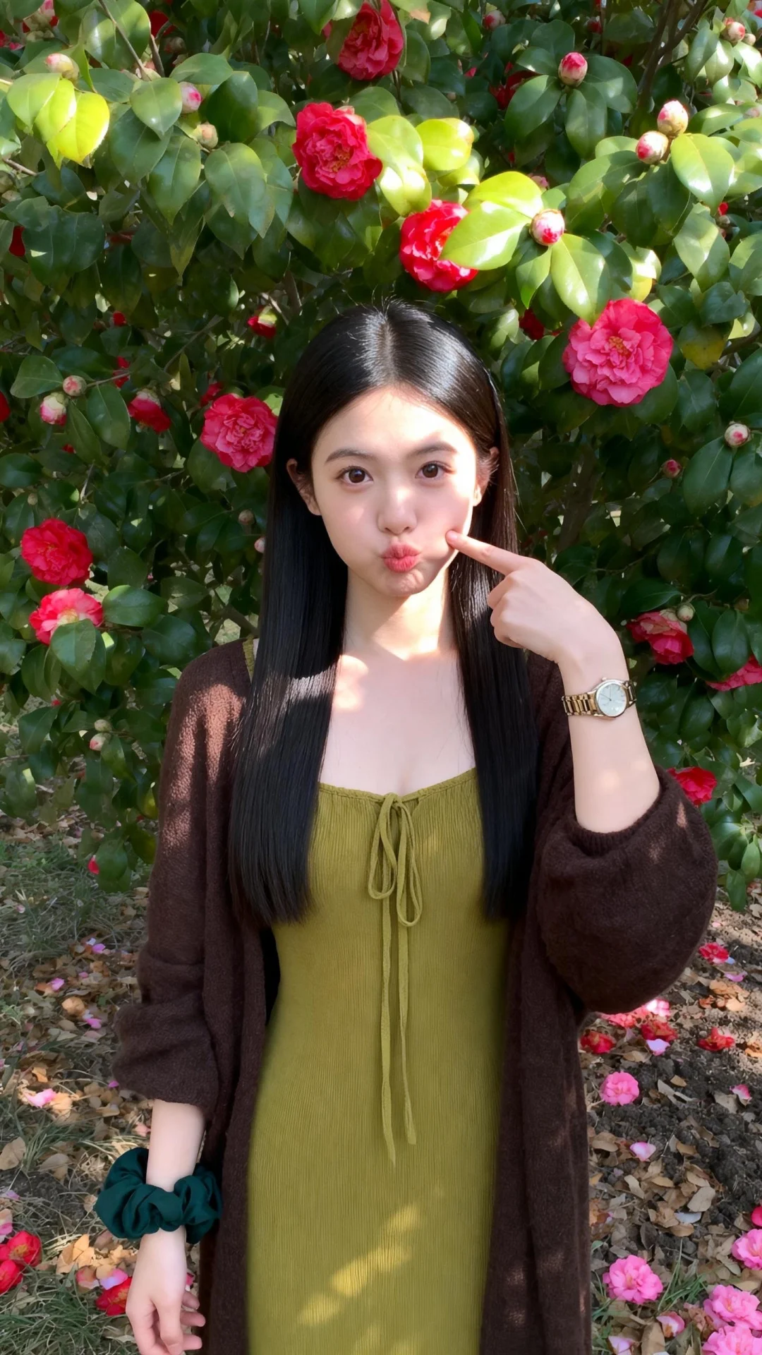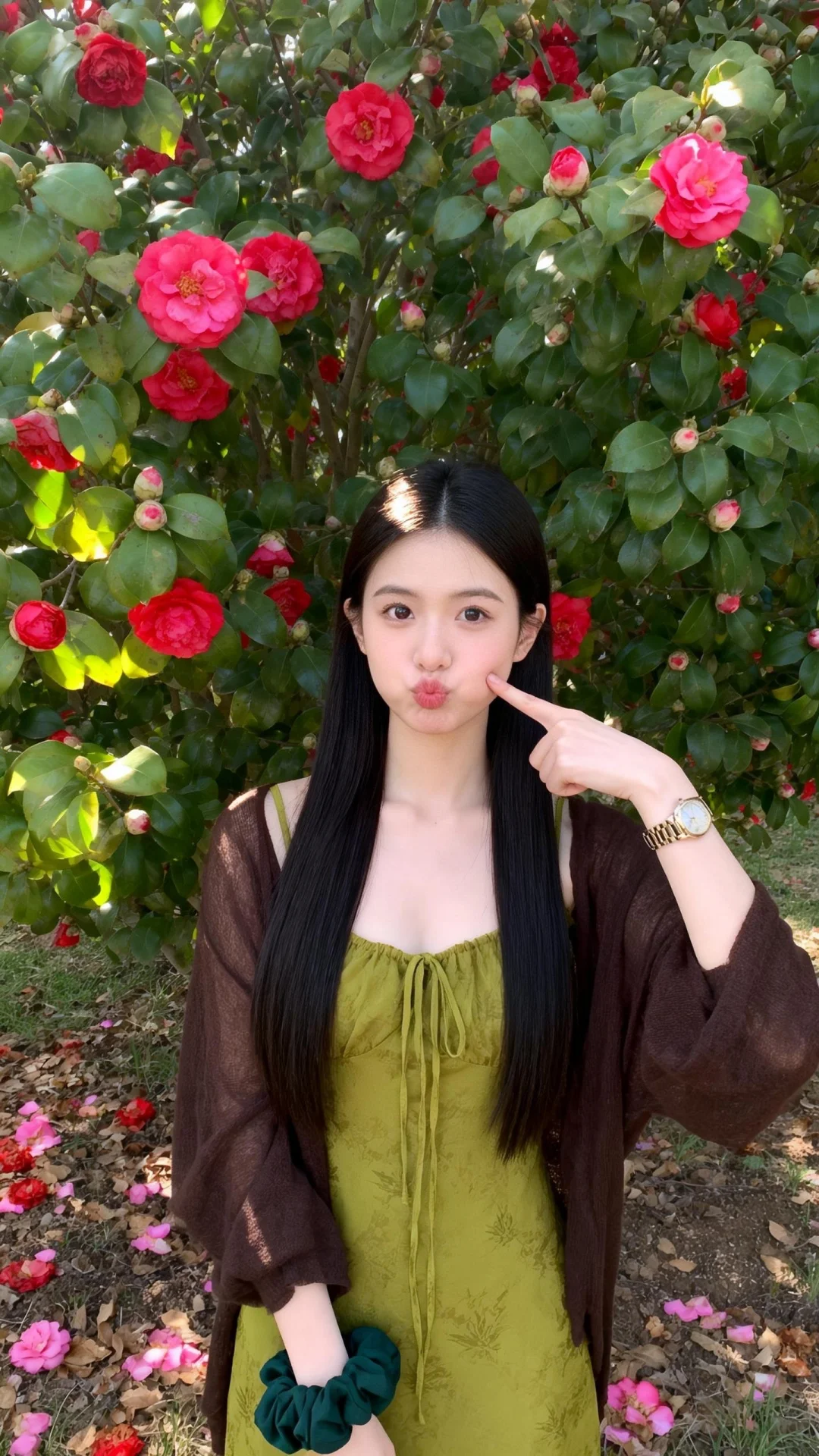 她身后是一丛生长得极为茂密的山茶花树,几乎占据了整个上半画面: