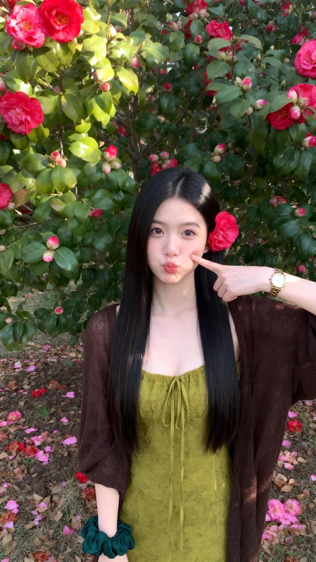 她的穿搭很有春日氛围感:内搭是一件芥末绿色的吊带裙,裙身带有细腻的暗纹肌理感,胸口处做了系带设计,两根同色系的绳带自然垂下,领口是大方领,露出了精致的锁骨和颈部线条;外面套着一件深棕色的薄款开衫,宽松的开衫带着慵懒感,和内搭的绿色形成柔和的撞色。她的左手手腕上戴着一只金属表带的手表,右手的手腕处则系着一个深墨绿色的布艺大肠发圈,和整体的色调呼应。