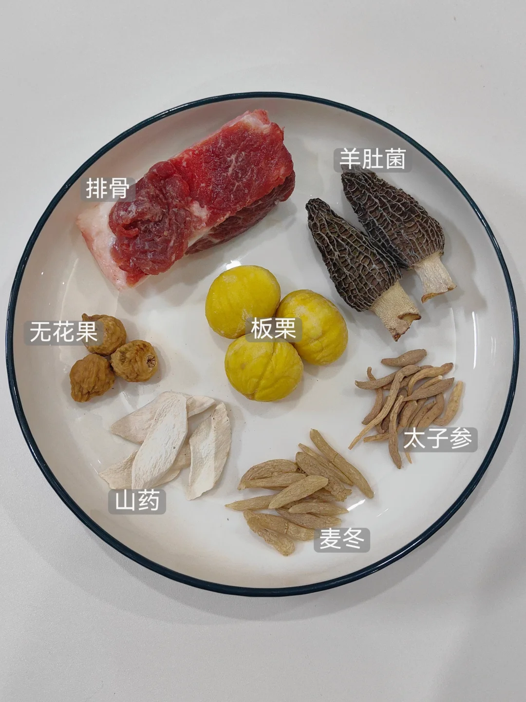 排骨、羊肚菌、太子参、麦冬、无花果、板栗、山药