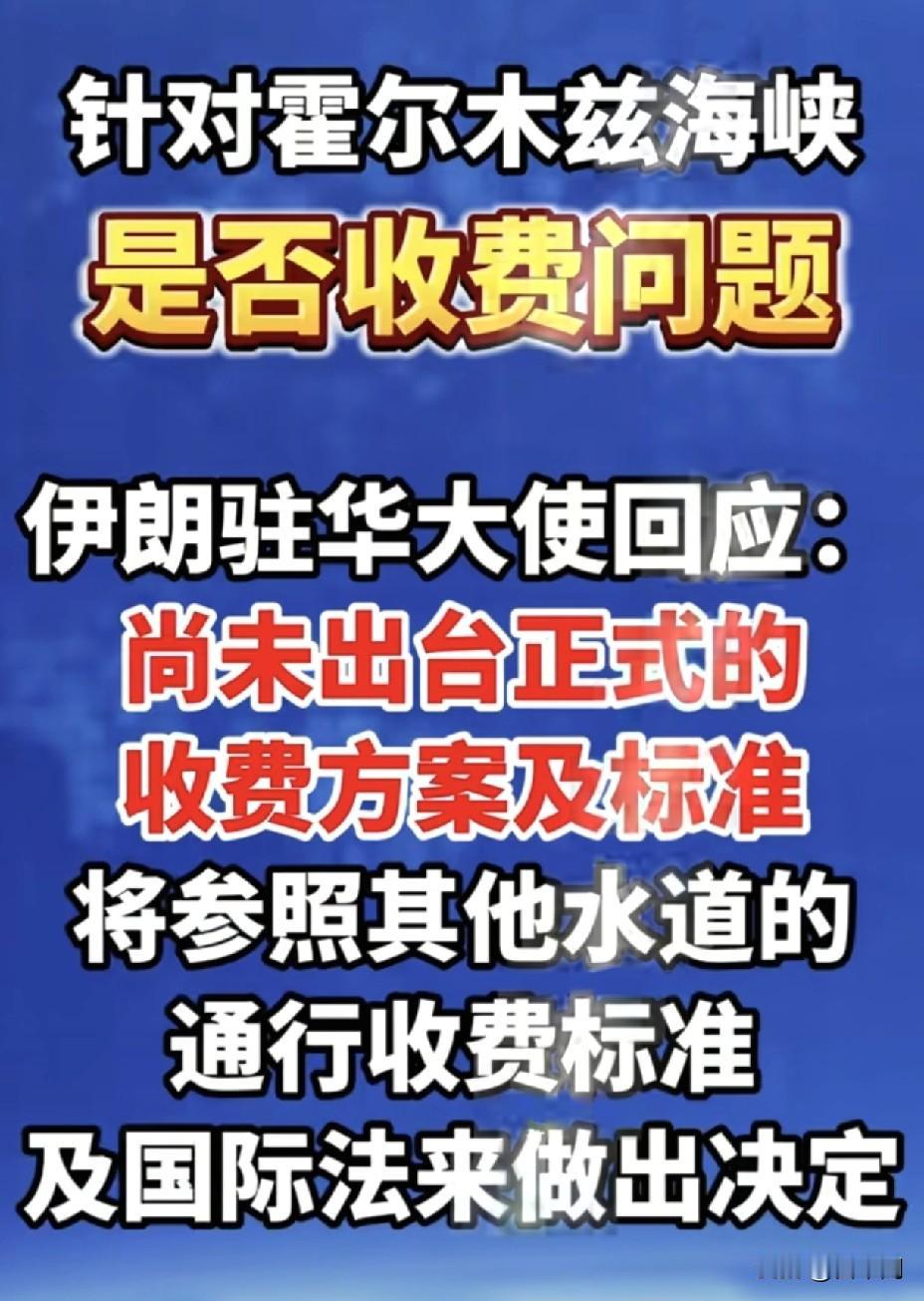 针对霍尔木兹海峡是否收费的热点问题,伊朗驻华大使法兹里4月8日在北京作出最新回应:伊朗尚未出台正式的收费方案及标准,后续将参照国际通行水道收费规则与国际法作出决定,直接驳斥了美媒“已达成收费协议”的不实爆料 。