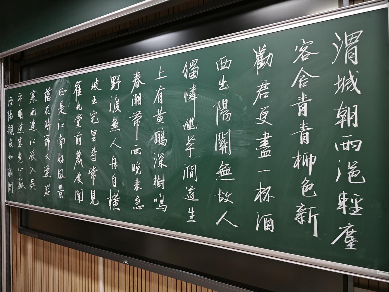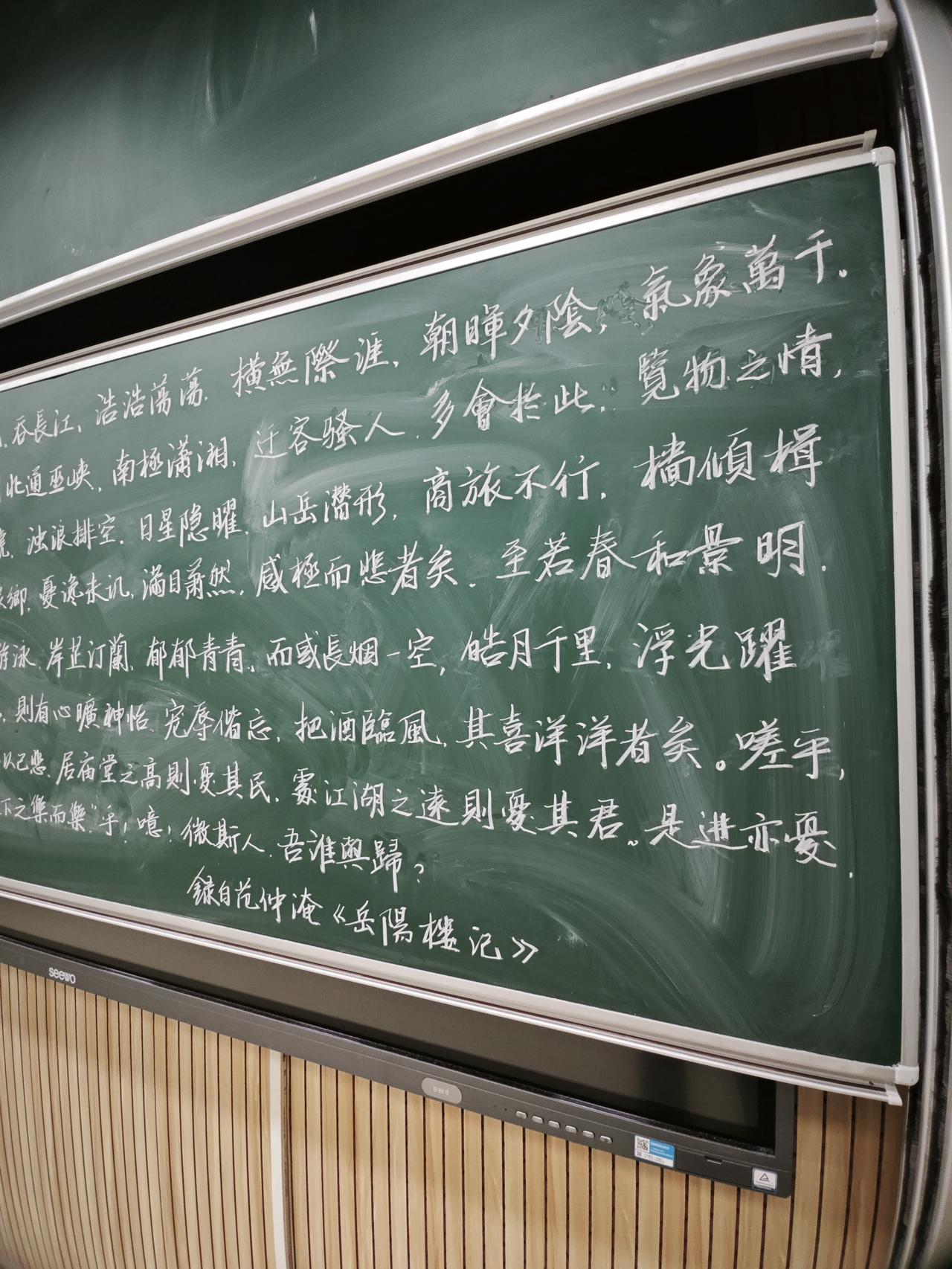 今日下午,年轻老师粉笔字交流活动,算是在退休之前发挥一点余热。写完之后发现黑板没有擦干净[流泪]。个人的一点感悟,写字要注意三个方面:1,笔画要到位。2,结构要稳重。3,整体布局要舒服。在漫长的教书生涯中,我度过了四年纯板书的岁月,没有PPT也没有投影,小黑板就是PPT,每天上课前把例题写在小黑板上,正反两面各一道题,那就是那个年代的PPT。岁月流逝,现在的教学设施真的太先进了,手指一点想啥有啥,真好。可能正因为如此,所以整体写字水平是在退步,因为写一手好字已经不那么重要了。但把字写得清晰整洁,还是很有必要的。教育 硬笔字粉笔字
