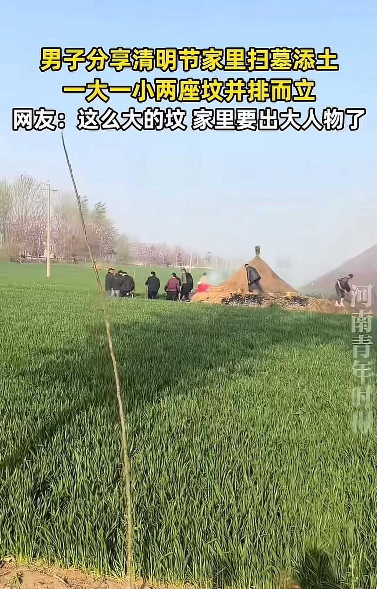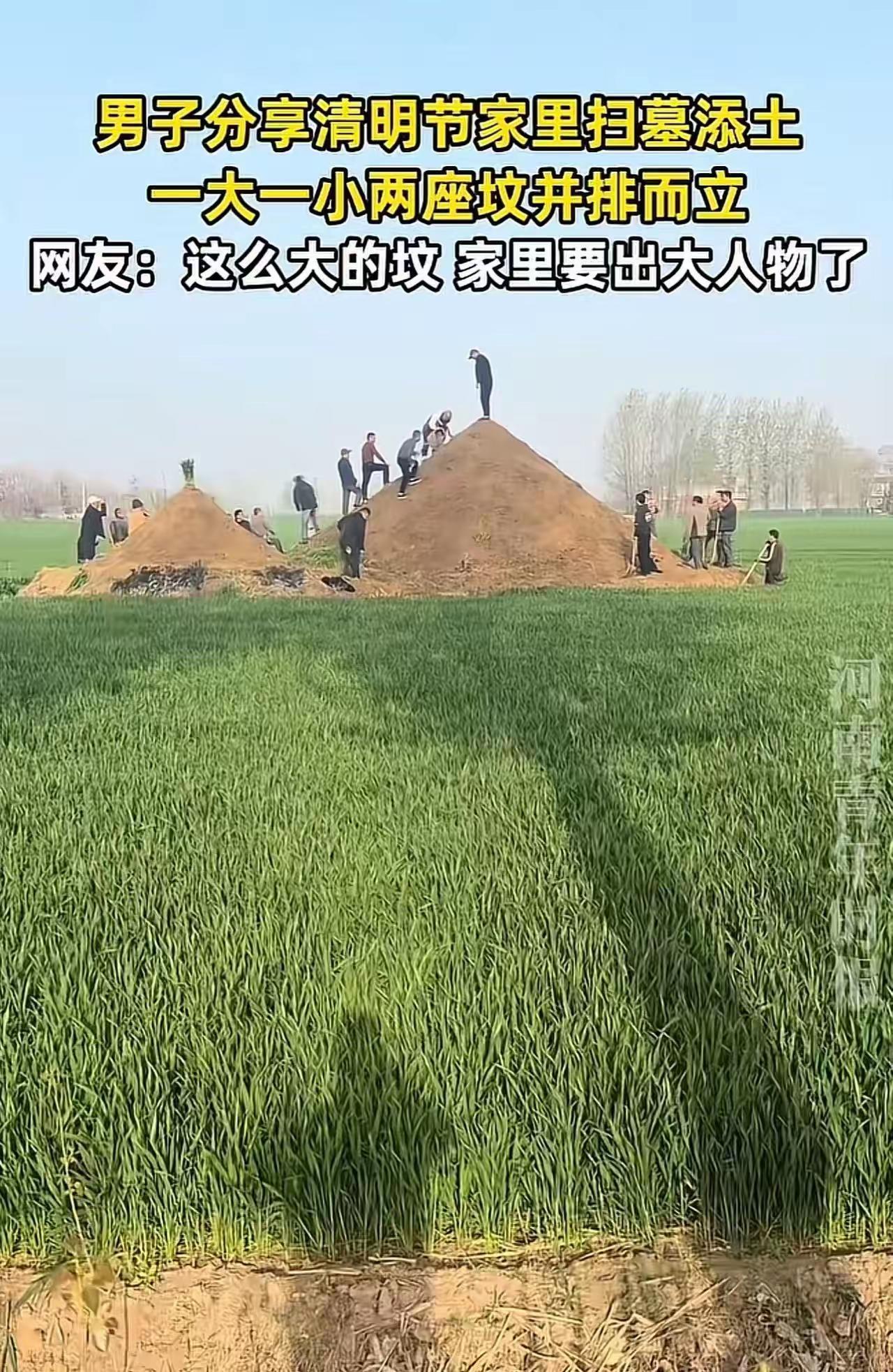 清明节,河南一位男子带着家族几十口人,给老祖宗扫墓添土,硬是把坟墓堆成了一座小山丘。他满脸自豪地说:“堆得越高,风水越好!”