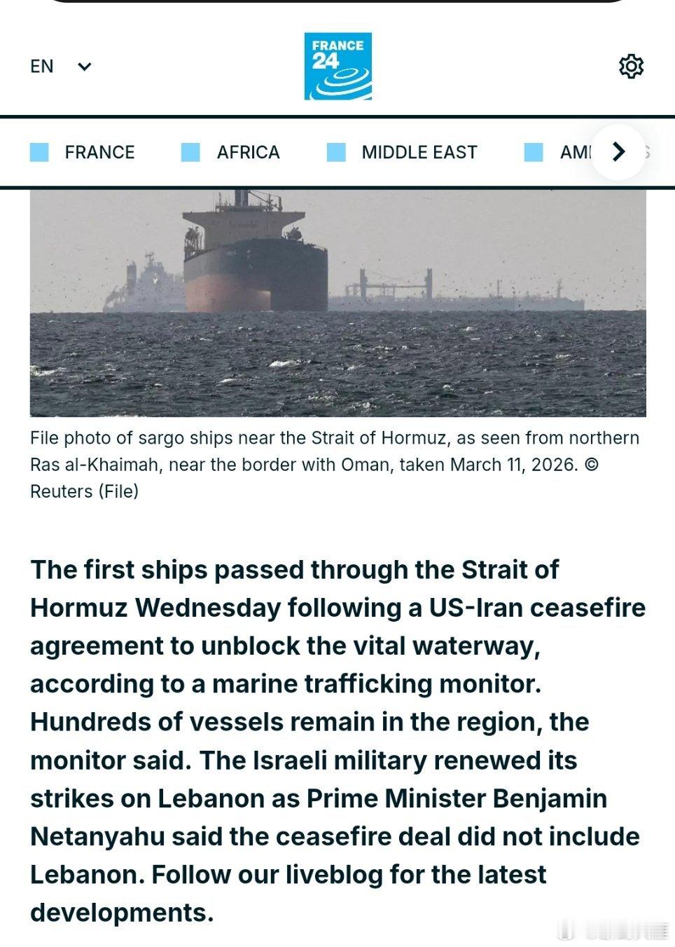 该监测人员表示,仍有数百艘船只滞留在该地区。以色列军方继续对黎巴嫩发动袭击,内塔尼亚胡称该停火协议未涵盖黎巴嫩。(法国24新闻台)