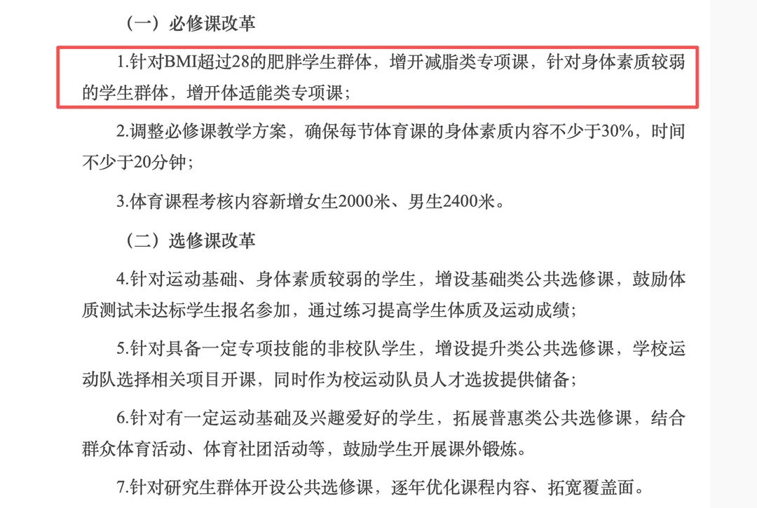其中,必修课改革具体的内容为:针对BMI超过28的肥胖学生群体,增开减脂类专项课,针对身体素质较弱的学生群体,增开体适能类专项课;调整必修课教学方案,确保每节体育课的身体素质内容不少于30%,时间不少于20分钟;体育课程考核内容新增女生2000米、男生2400米。网页链接