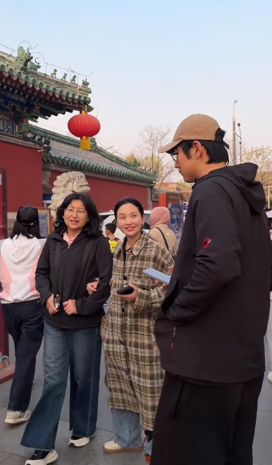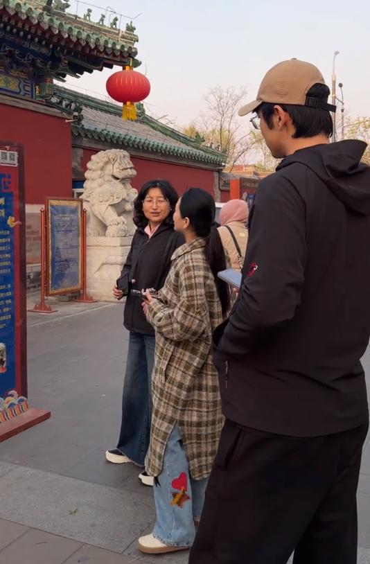 金莎和孙丞潇带着孙妈妈北京度假,穿着格纹长款大衣的金莎主动挽着婆婆手臂,笑容甜美