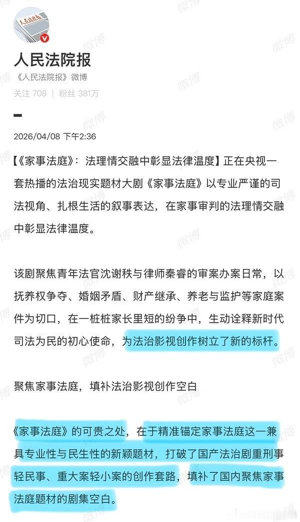 人民法院报发文:《家事法庭》的可贵之处,在于精准锚定家事法庭这一兼具专业性与民生性的新颖题材,打破了国产法治剧重刑事轻民事、重大案轻小案的创作套路,填补了国内聚焦家事法庭题材的剧集空白。龚俊家事法庭