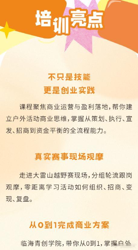 从爱玩到会赚临海青年解锁户外新业态临海青创户外操盘手培训班火热开启,集赛事观摩、理论学习、方案答辩与实操落地于一体,手把手教学,助力青年掌握赛事运营、实现商业变现,让爱好变事业,为户外产业注入青春活力。