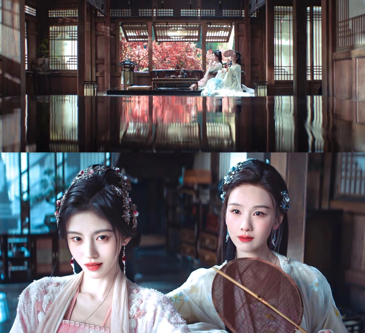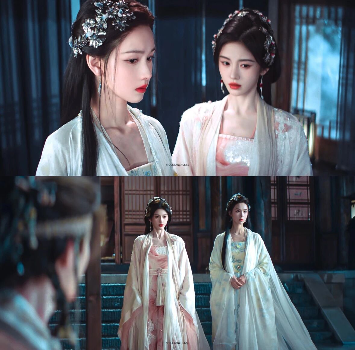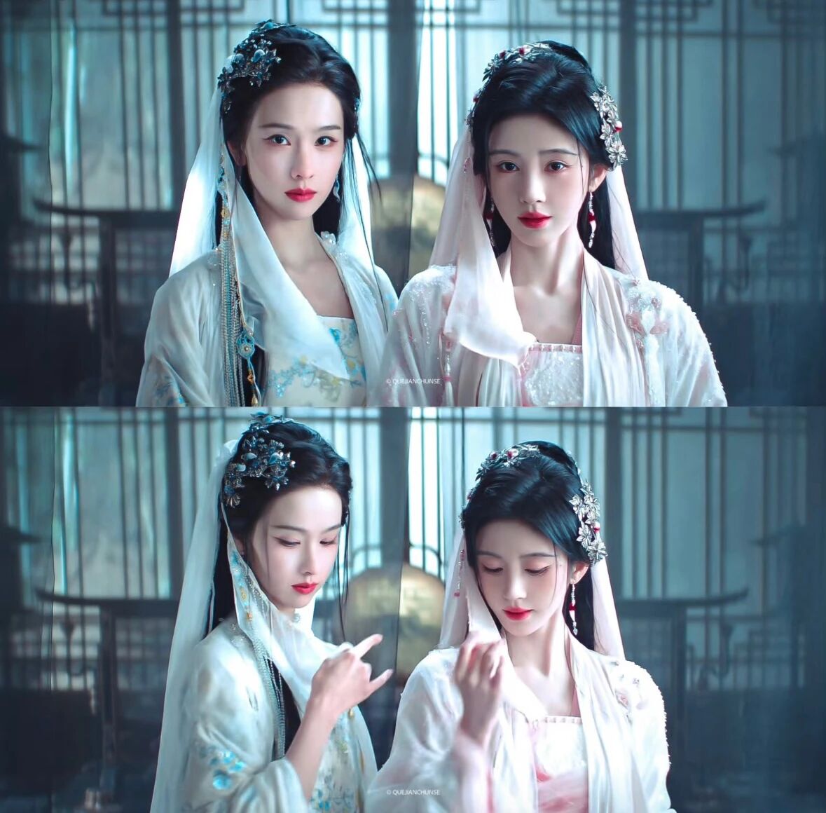 《月鳞绮纪》中两人饰演共享记忆的九尾狐姐妹,直播“记忆共享失灵”的荒诞感强化了喜剧效果。鞠婧祎(饰活泼狐妖露芜衣)的灵动与陈都灵(饰清冷祭司雾妄言)的沉稳形成天然性格屏障,加剧了动作失调。