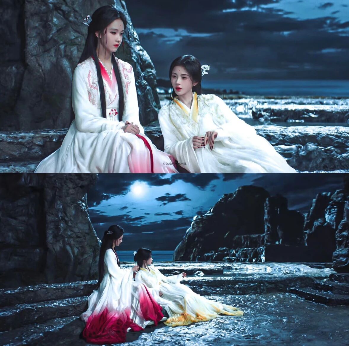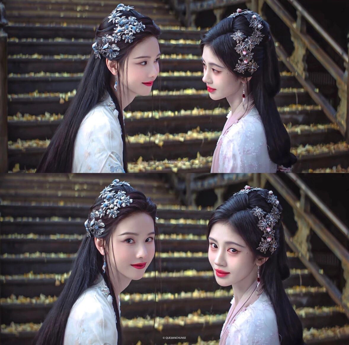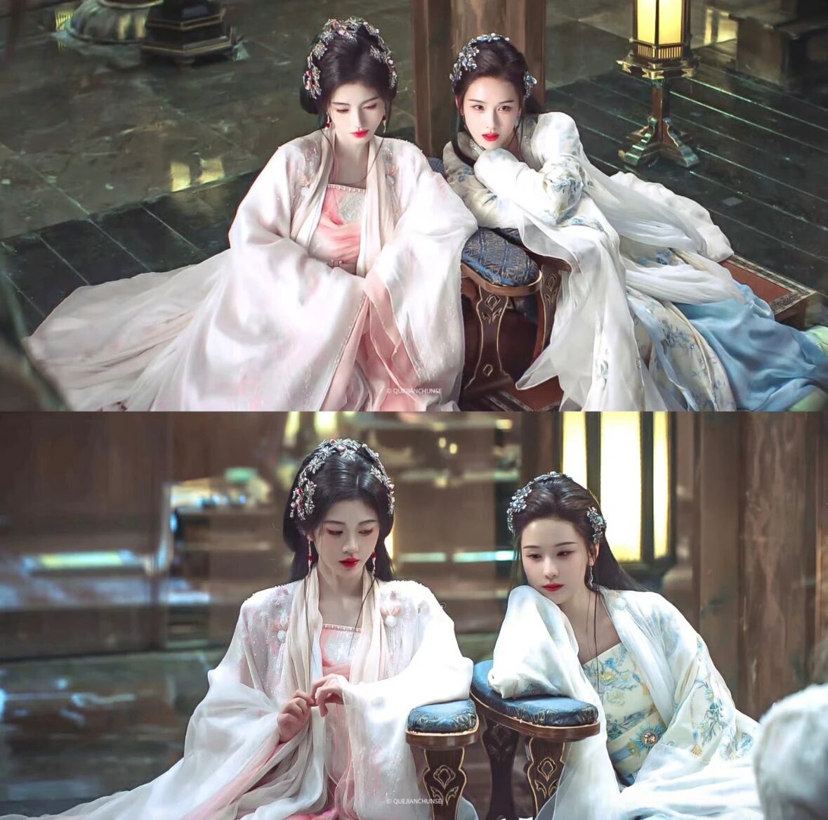 《月鳞绮纪》中两人饰演共享记忆的九尾狐姐妹,直播“记忆共享失灵”的荒诞感强化了喜剧效果。鞠婧祎(饰活泼狐妖露芜衣)的灵动与陈都灵(饰清冷祭司雾妄言)的沉稳形成天然性格屏障,加剧了动作失调。