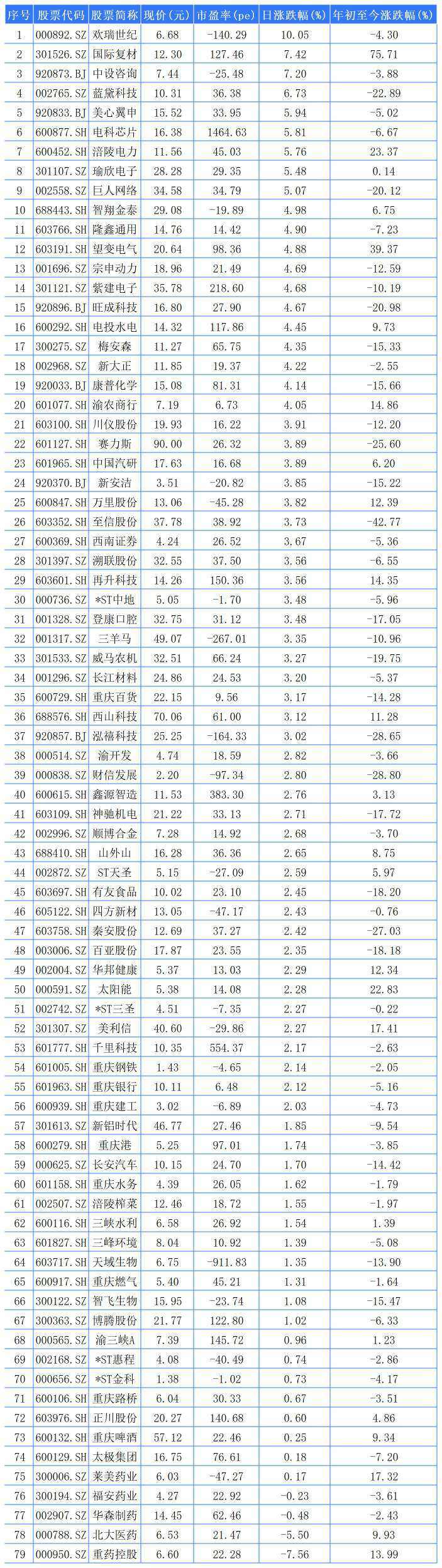 79家重庆A股上市公司中,75家上涨,0家平收,4家下跌。