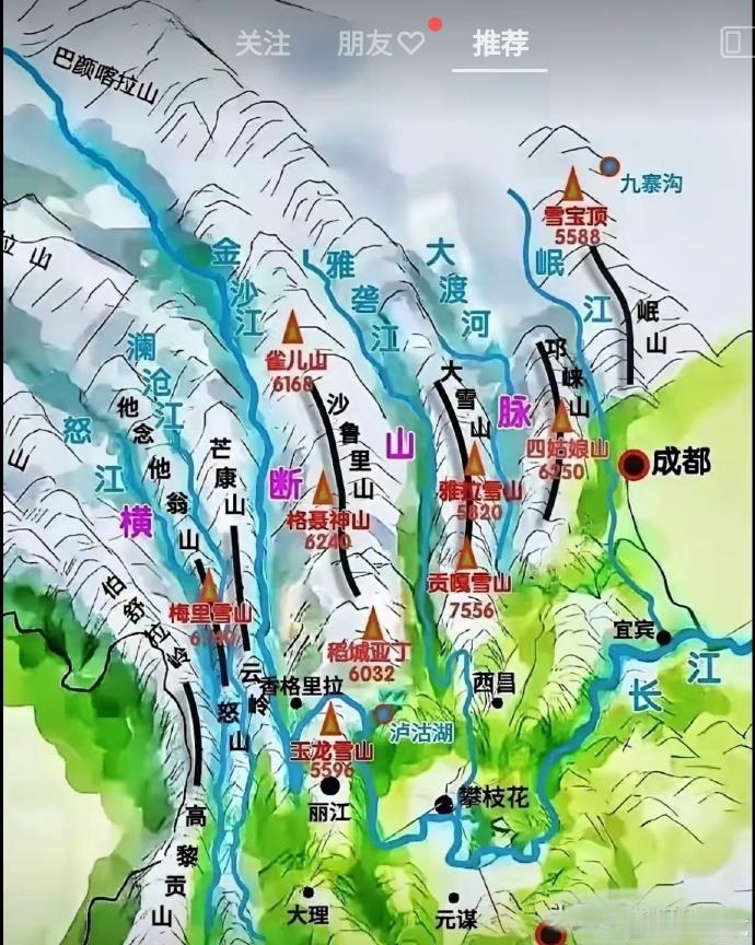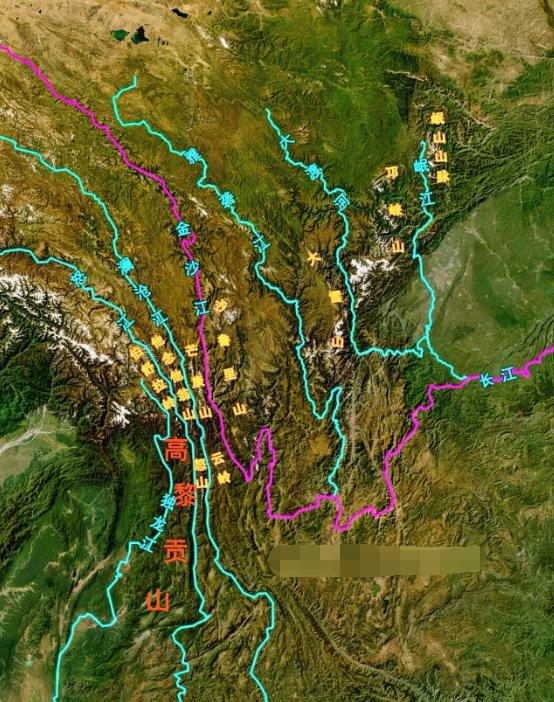 大家可以看到独龙、怒江、澜沧江这三条大河,分别向南流入到了缅甸和东南亚地区,而只有金沙江在云岭附近,突然来了个九十度大拐弯,一路向北,之后继续向东方向前进,成就了我们今天的长江。要不然我们今天的长江的源头,就要变成雅砻江了,而不是金沙江以及更远的远方。