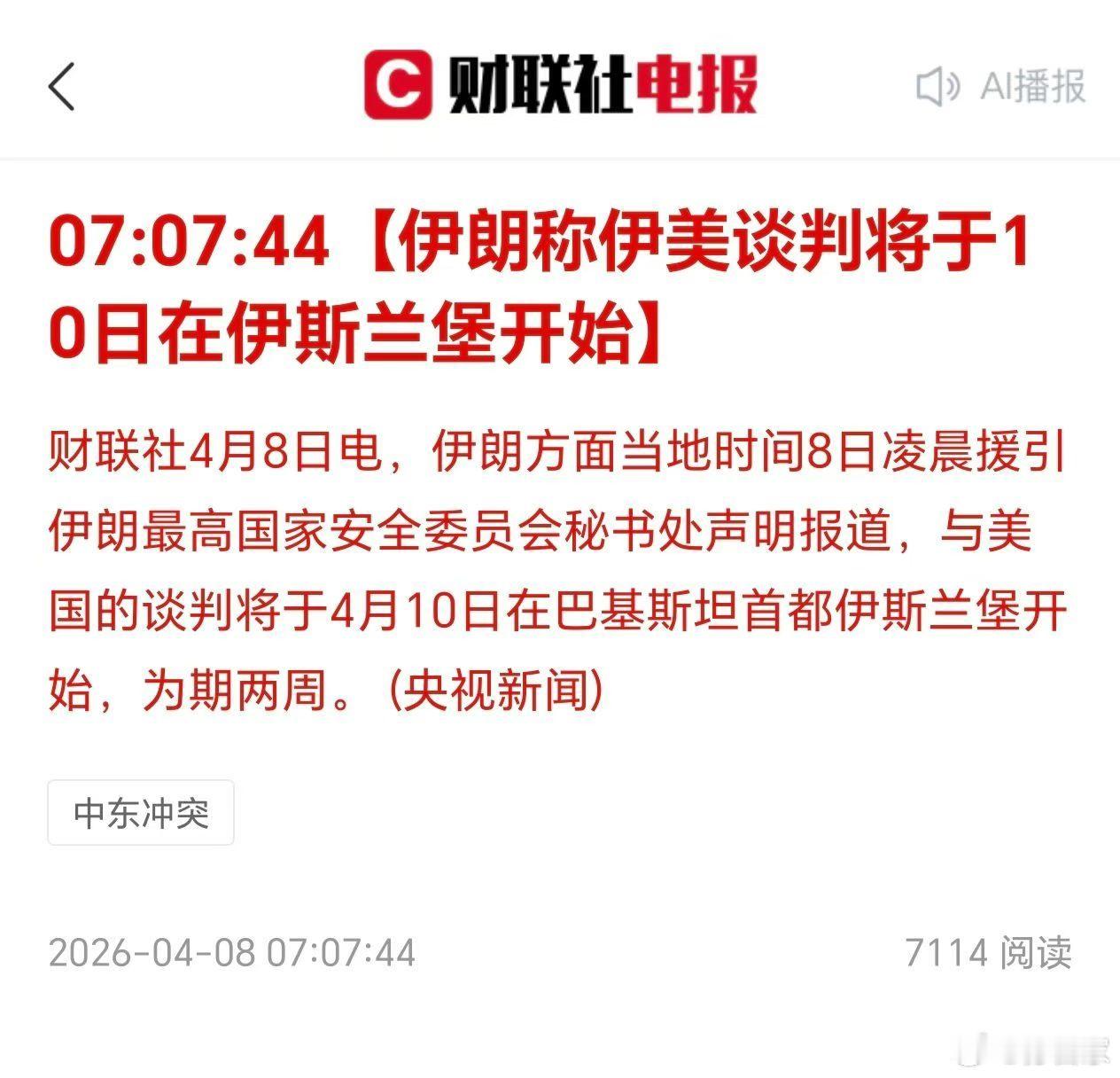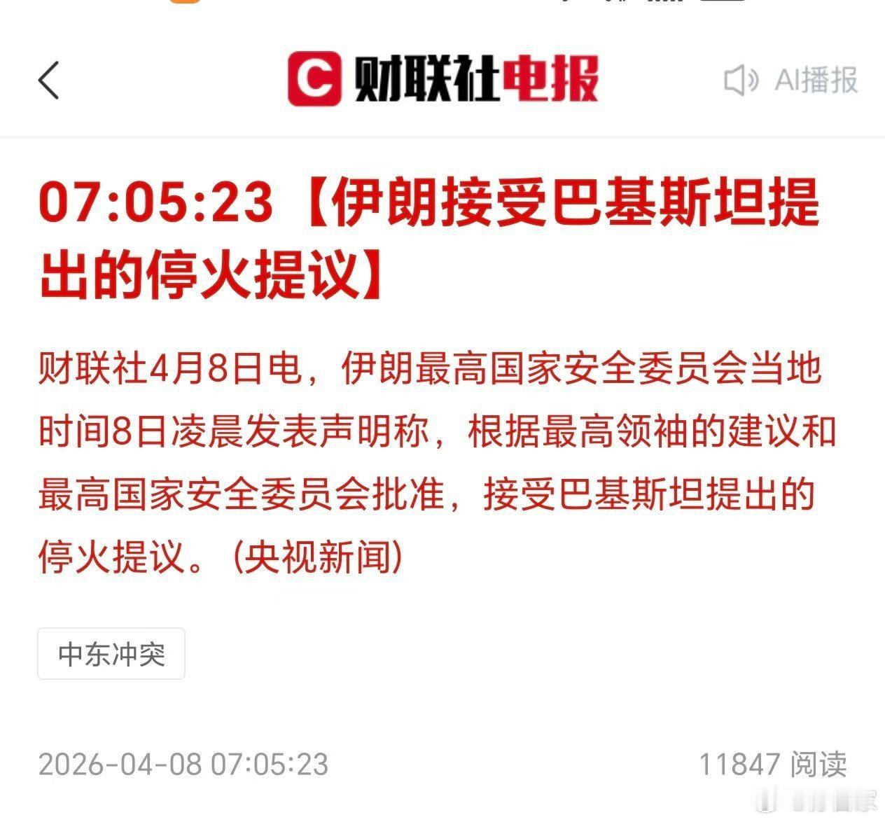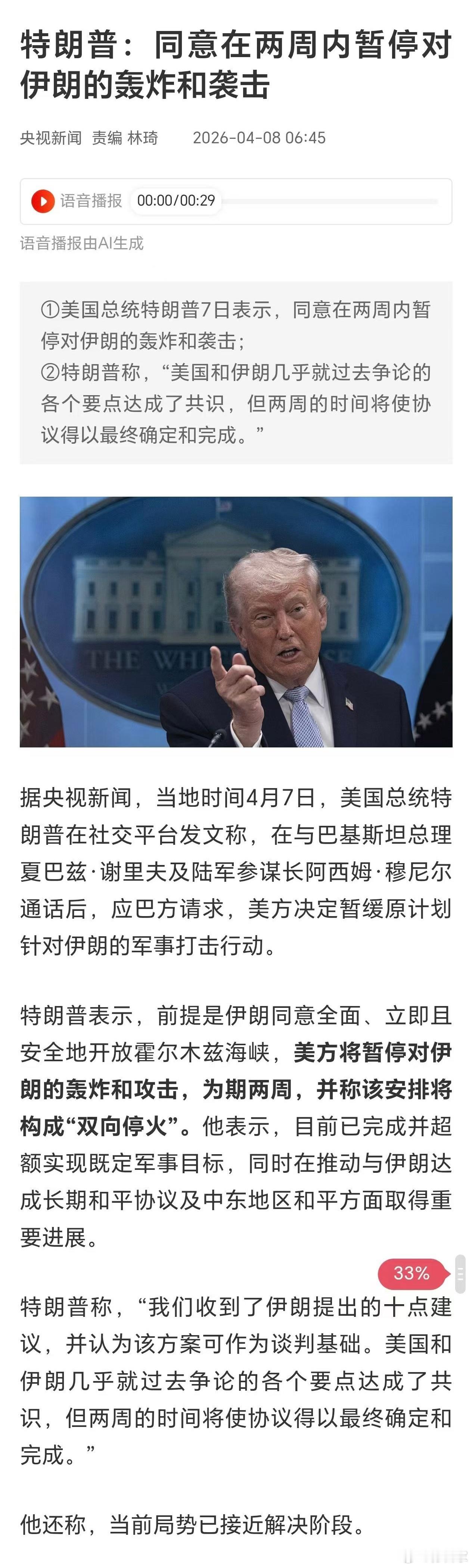 特朗普:同意在两周内暂停对伊朗的轰炸和袭击