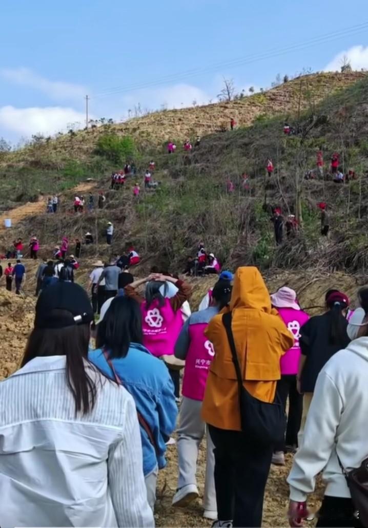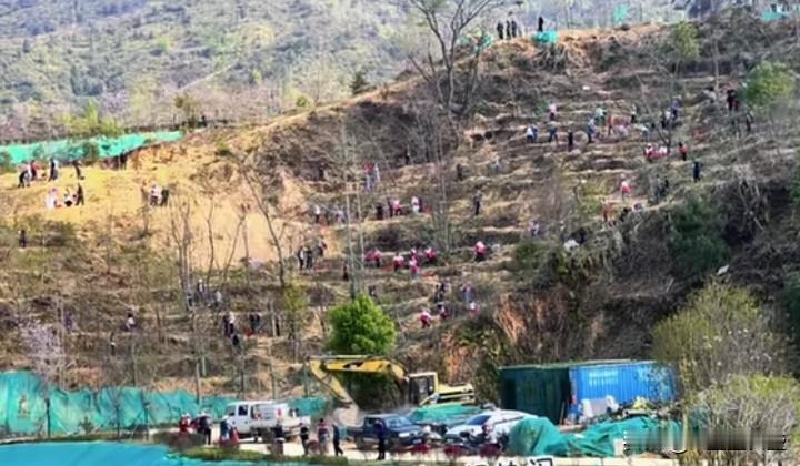 绿化大行动,满山遍野的人在植树造林,干群热情很高,令人振奋!