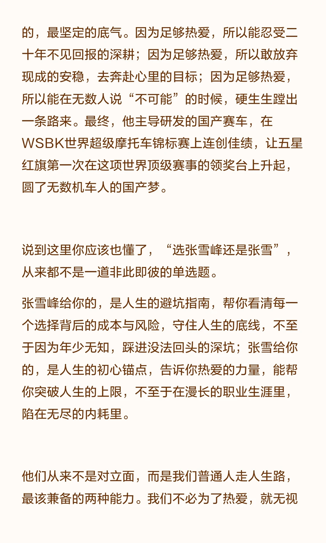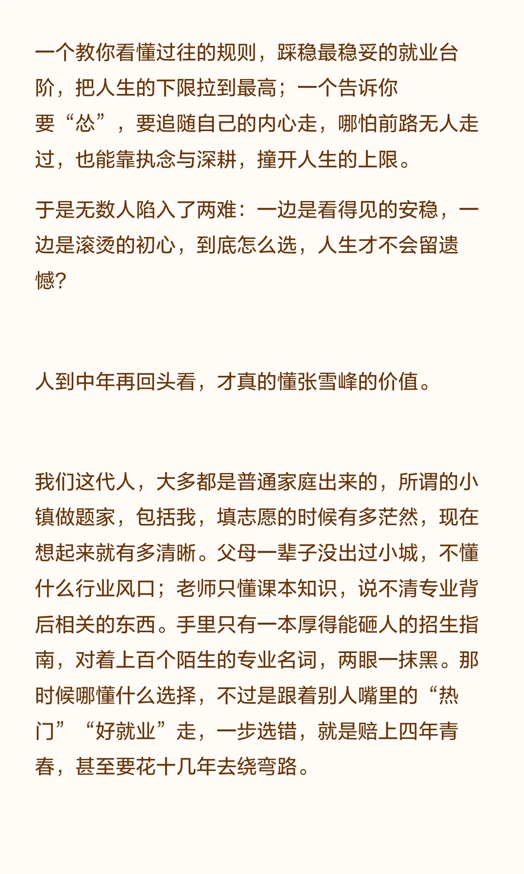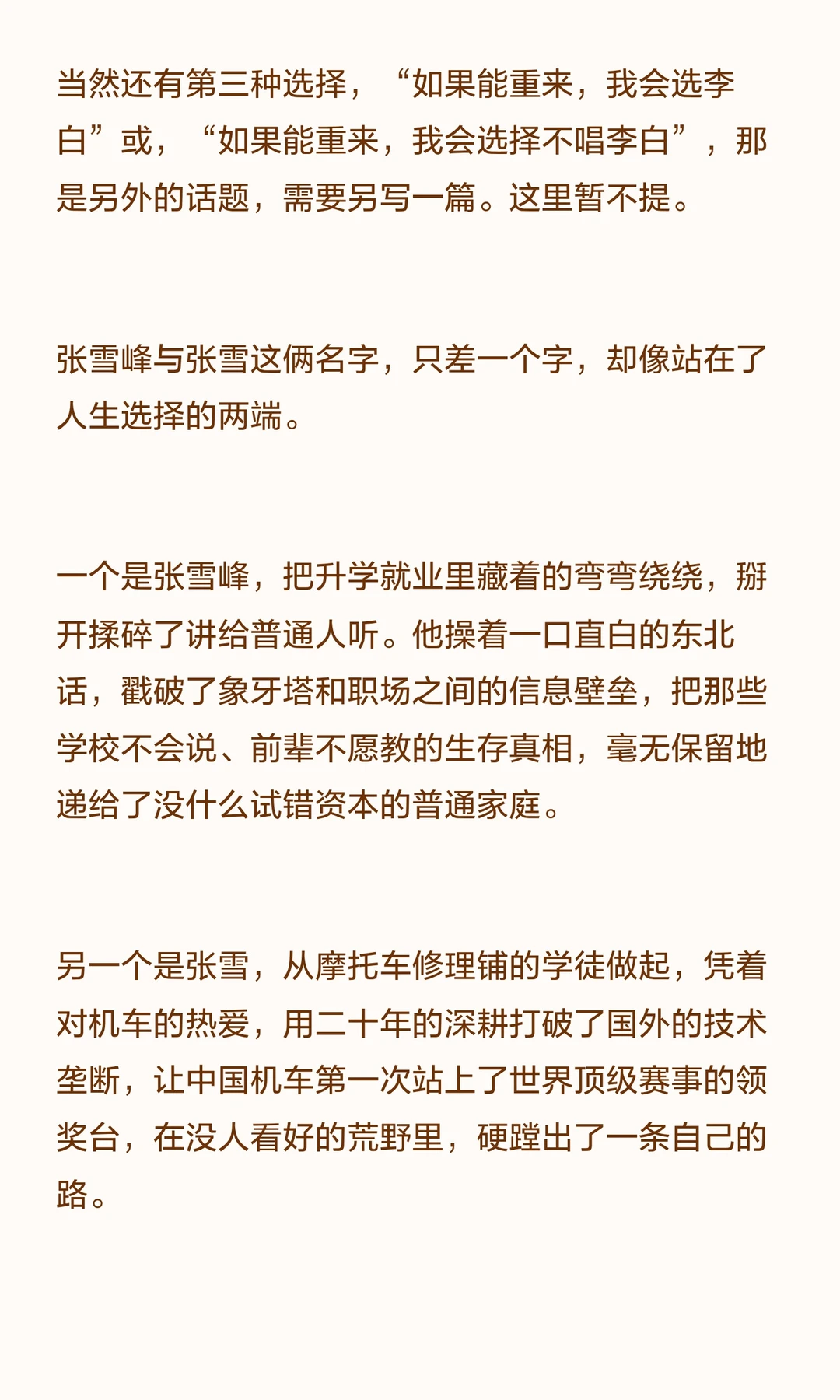 如果能重来,最优解不是选张雪峰,还是选张雪。而是既有张雪峰的清醒,能看清现实、避开弯路、守住底线;也有张雪的赤诚,能守住热爱、找到属于自己的那条路,然后坚定地走下去。