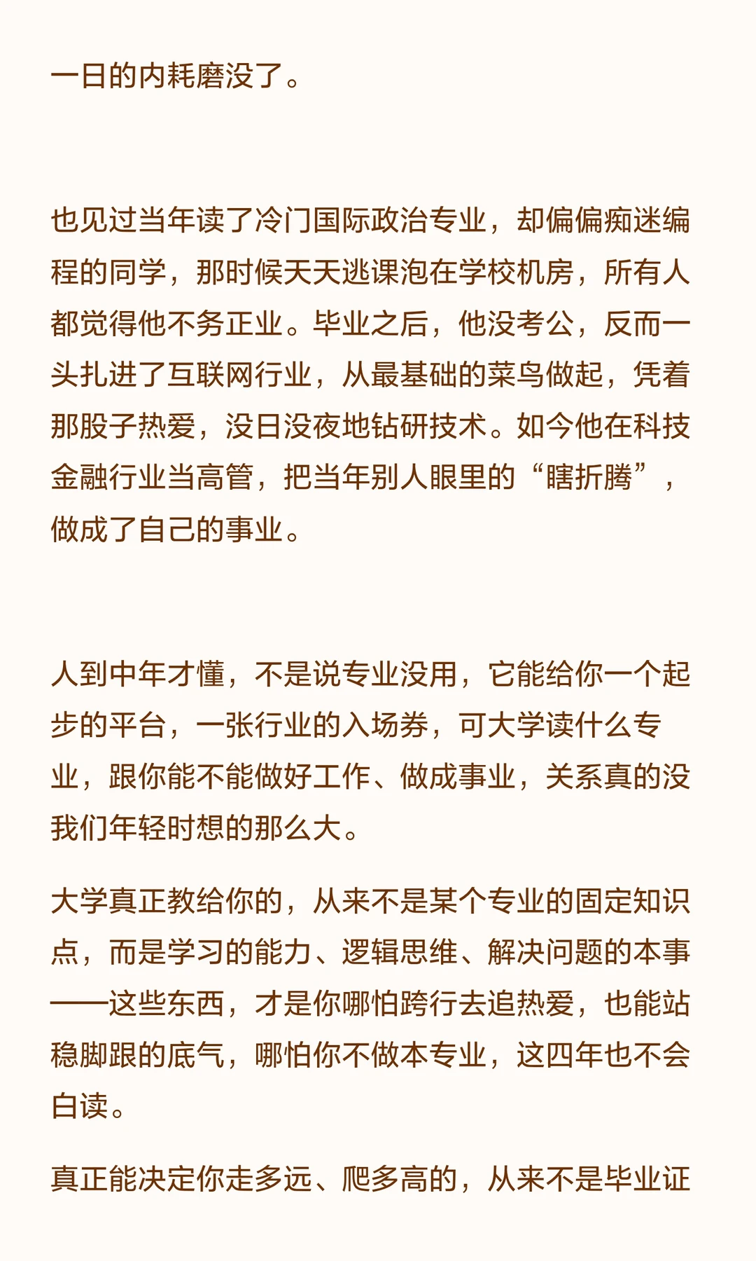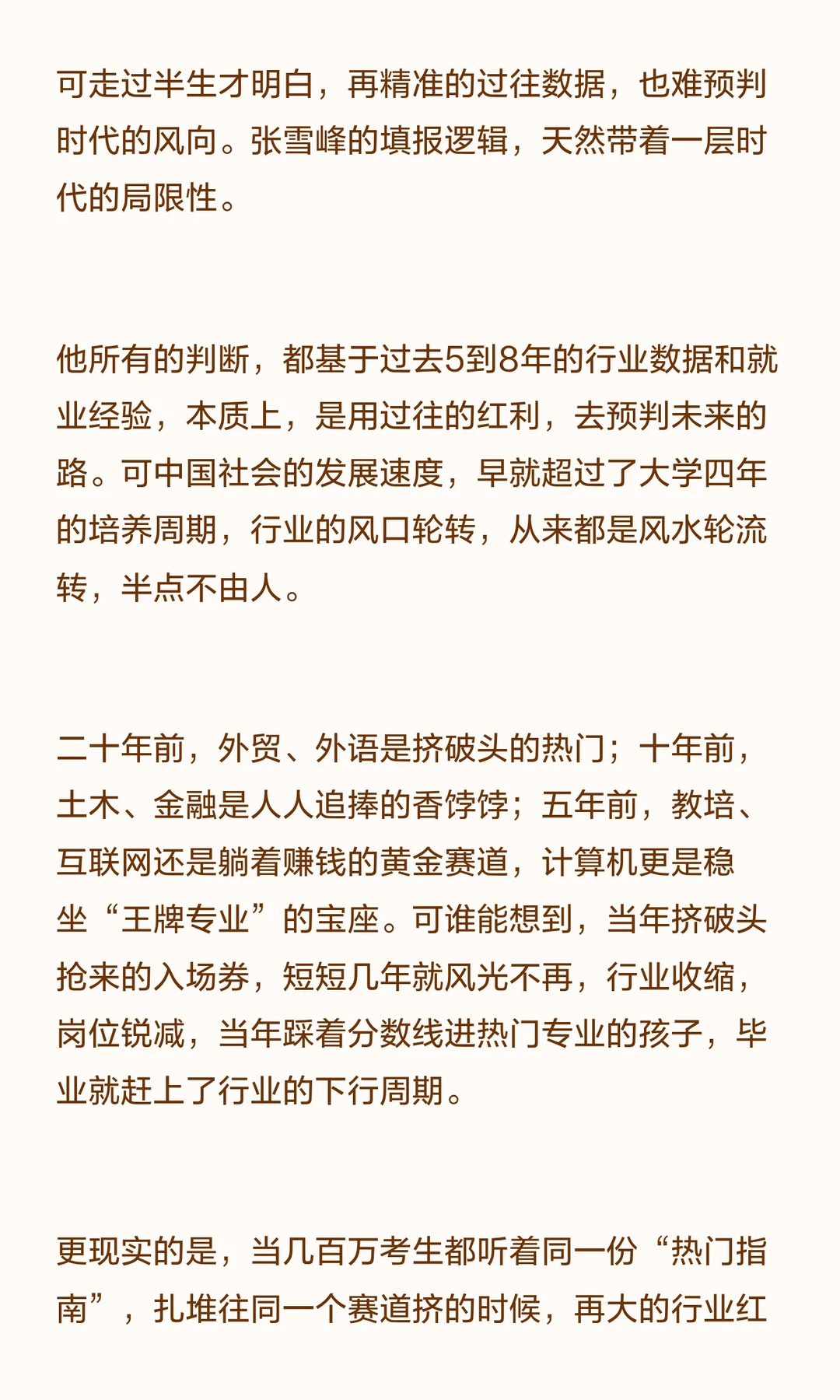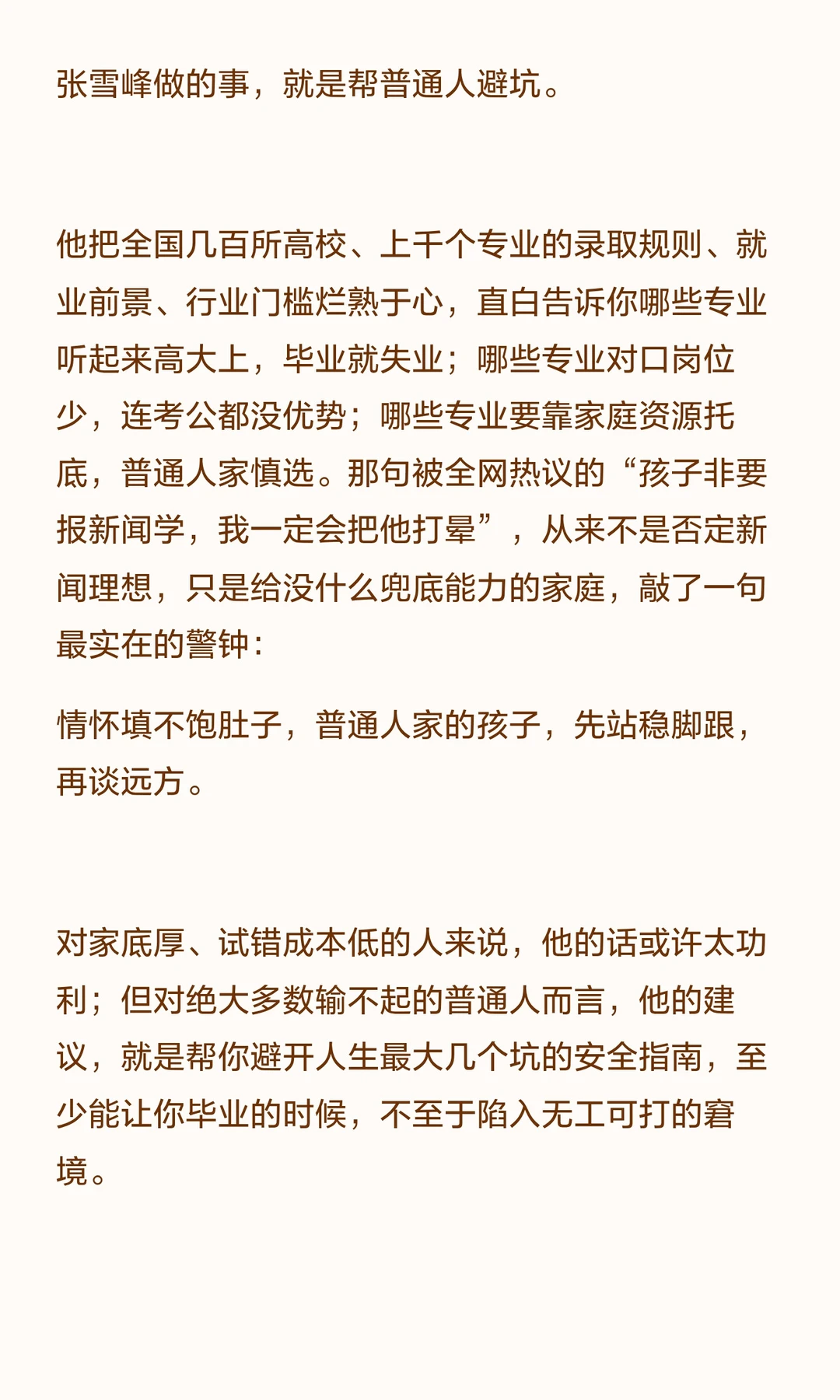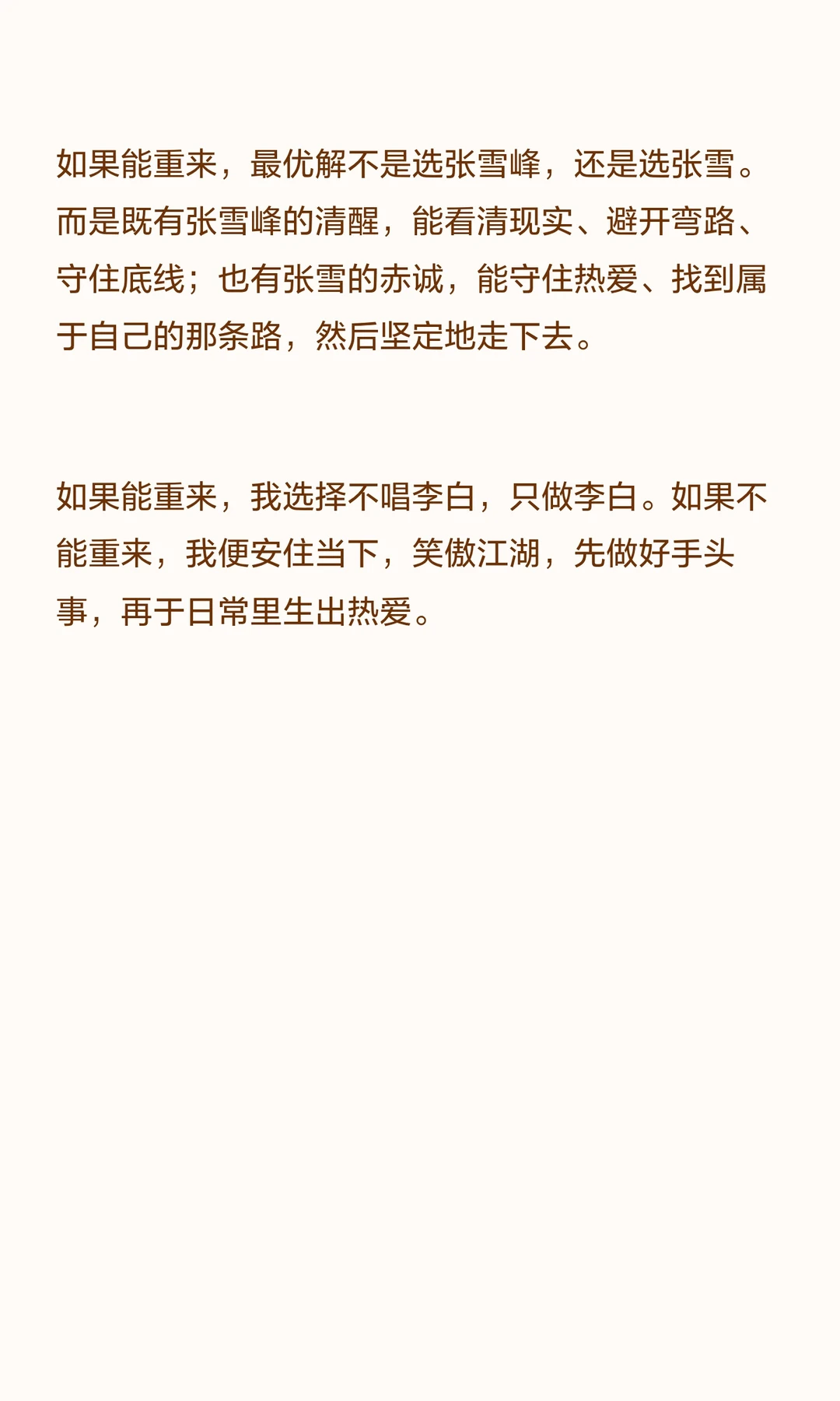 如果能重来,最优解不是选张雪峰,还是选张雪。而是既有张雪峰的清醒,能看清现实、避开弯路、守住底线;也有张雪的赤诚,能守住热爱、找到属于自己的那条路,然后坚定地走下去。