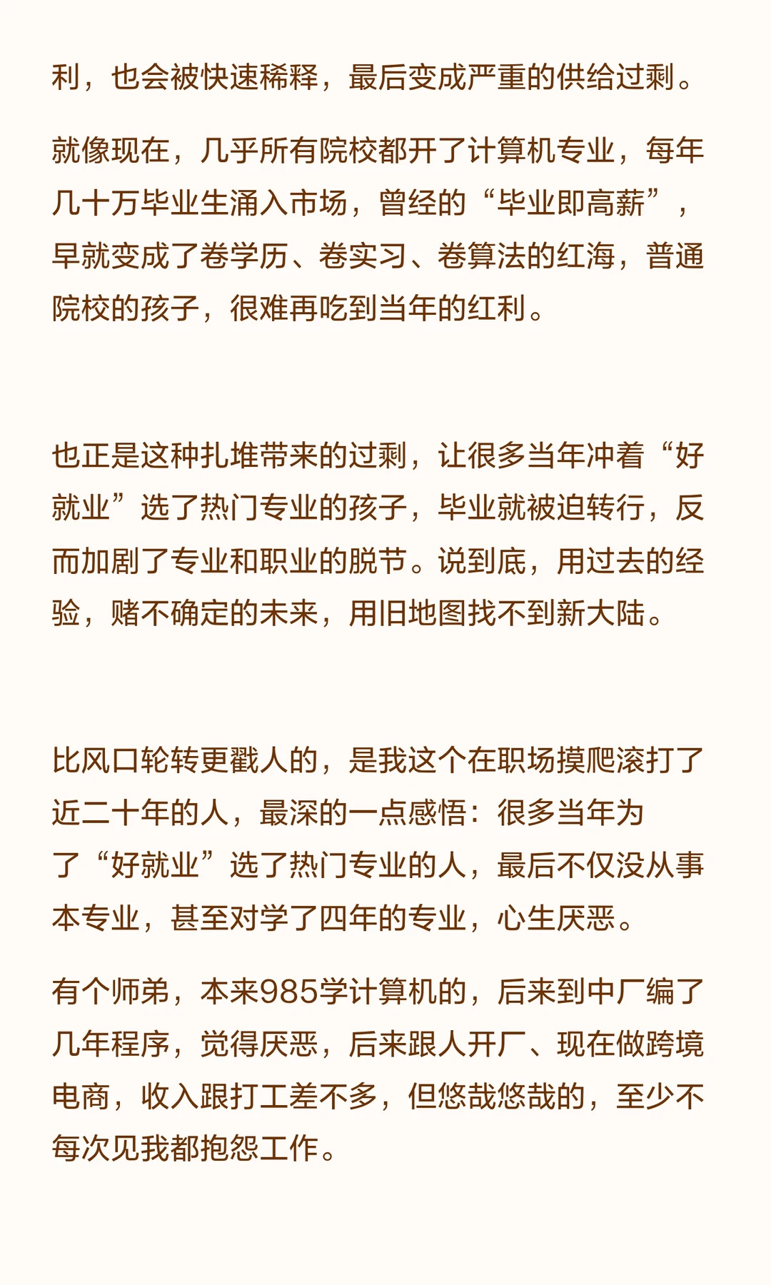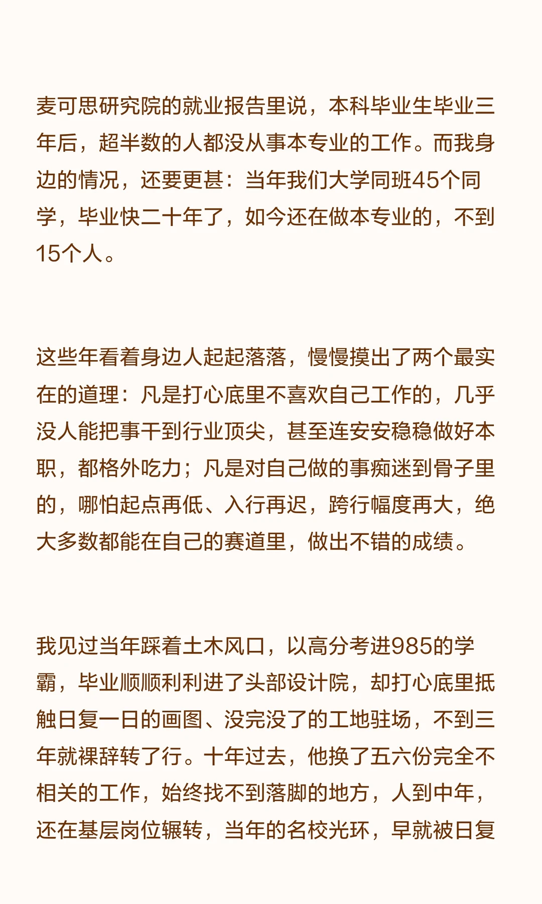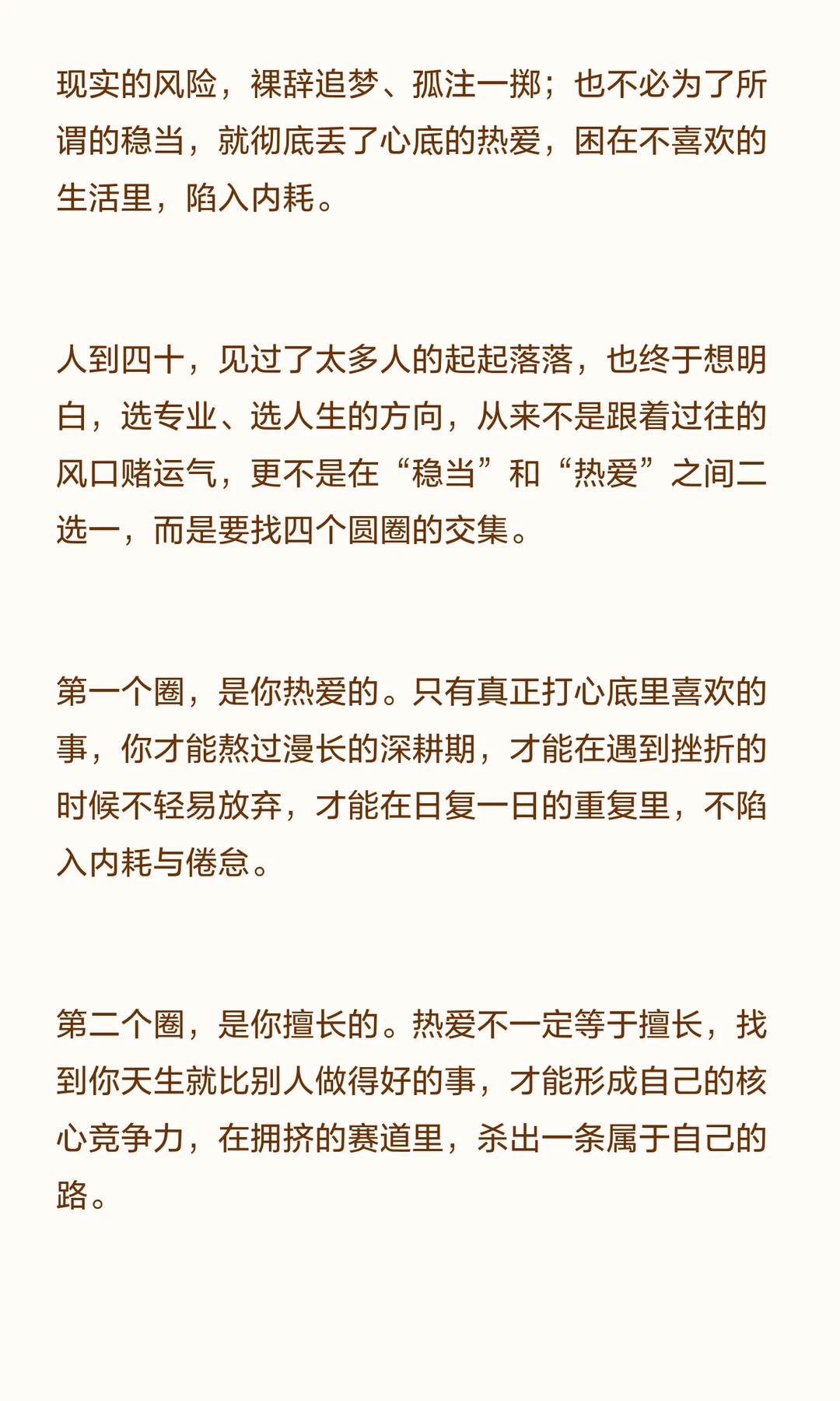 人到四十,见过了太多人的起起落落,也终于想明白,选专业、选人生的方向,从来不是跟着过往的风口赌运气,更不是在“稳当”和“热爱”之间二选一,而是要找四个圆圈的交集。