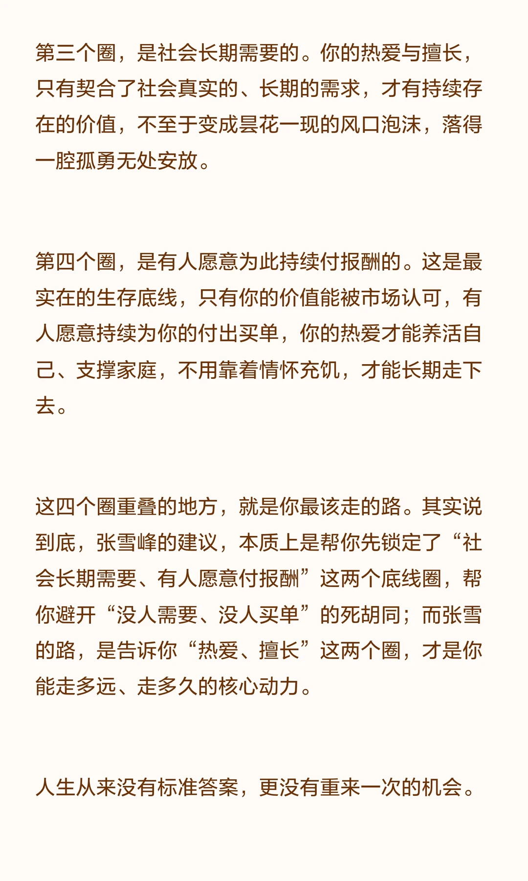第三个圈,是社会长期需要的。你的热爱与擅长,只有契合了社会真实的、长期的需求,才有持续存在的价值,不至于变成昙花一现的风口泡沫,落得一腔孤勇无处安放。