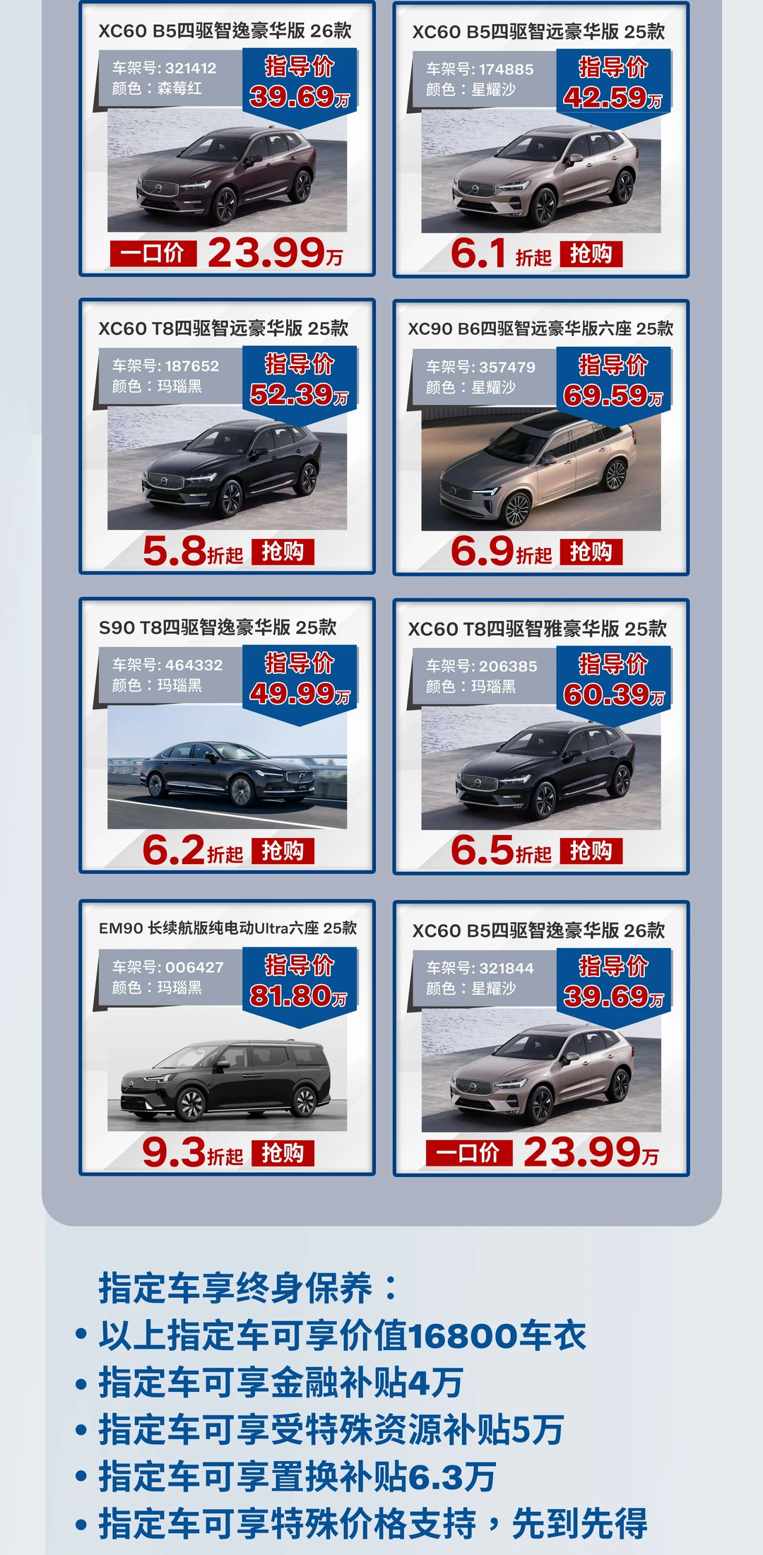 S60 5.6折起、XC40 7.6折起、EX30 8.2折起,还有XC60低至6.1折起!