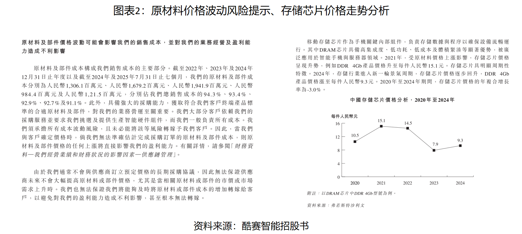 酷赛智能向时代商业研究院表示,招股书的“风险因素”章节已全面、如实披露了公司经营过程中面临的各类重大风险,包括但不限于原材料价格波动风险、供应链风险、市场竞争风险等。相关披露符合港交所关于“披露所有重大及具体风险”的监管要求。存储芯片价格受全球产业链供需影响处于动态变化中,后续公司将持续关注市场走势,并严格按照香港上市监管要求,及时、完整地更新相关风险披露内容。