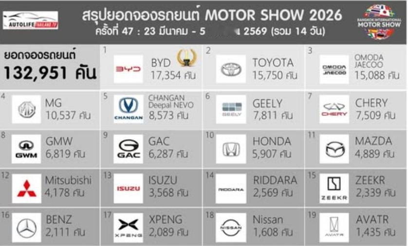 泰国长期被视作日本车的稳固阵地,当地车展向来是日系品牌展示实力的舞台。2026 年 3 月下旬落幕的曼谷国际车展,现场订单直接反映市场选择。比亚迪拿下订单总量第一,彻底打破日系长期垄断局面。本田、马自达等传统强势品牌排名跌至十名开外,与过往市场地位形成强烈反差。