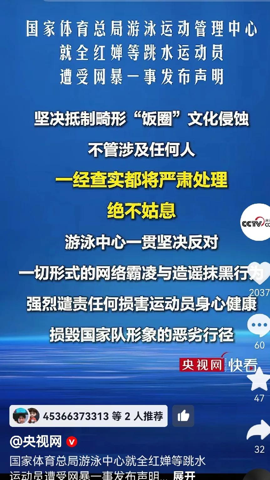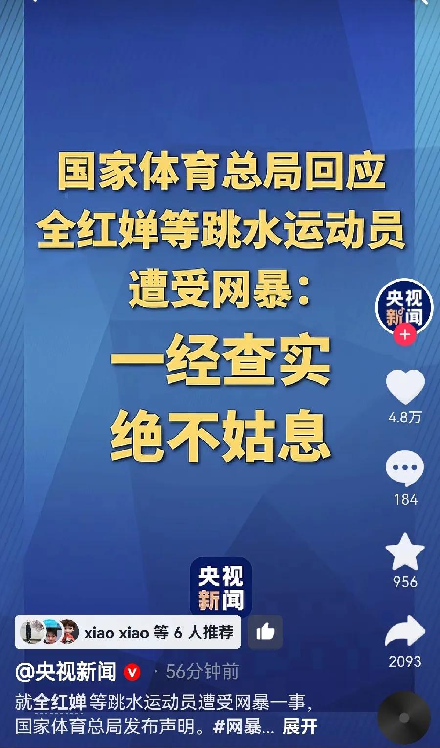 央视网 央视新闻 今天重磅报道了婵宝的网暴事件!曝光了一个有282人组成的微信群,专门侮辱骂讽刺婵宝!该群自2022年起成立,群成员对婵宝辱骂不断!作为一名为国争光的运动员,婵宝遭到如此仇恨,必定承受着巨大的心理压力!心灵的伤害无法估量!她为国争光,我们也希望她能得到国家的公正对待!能不能为她伸张正义!能不能让侮辱她的人付出代价!保护好运动员的心灵!也是保护好全国人民的信心!为国家体育局,央视点赞!