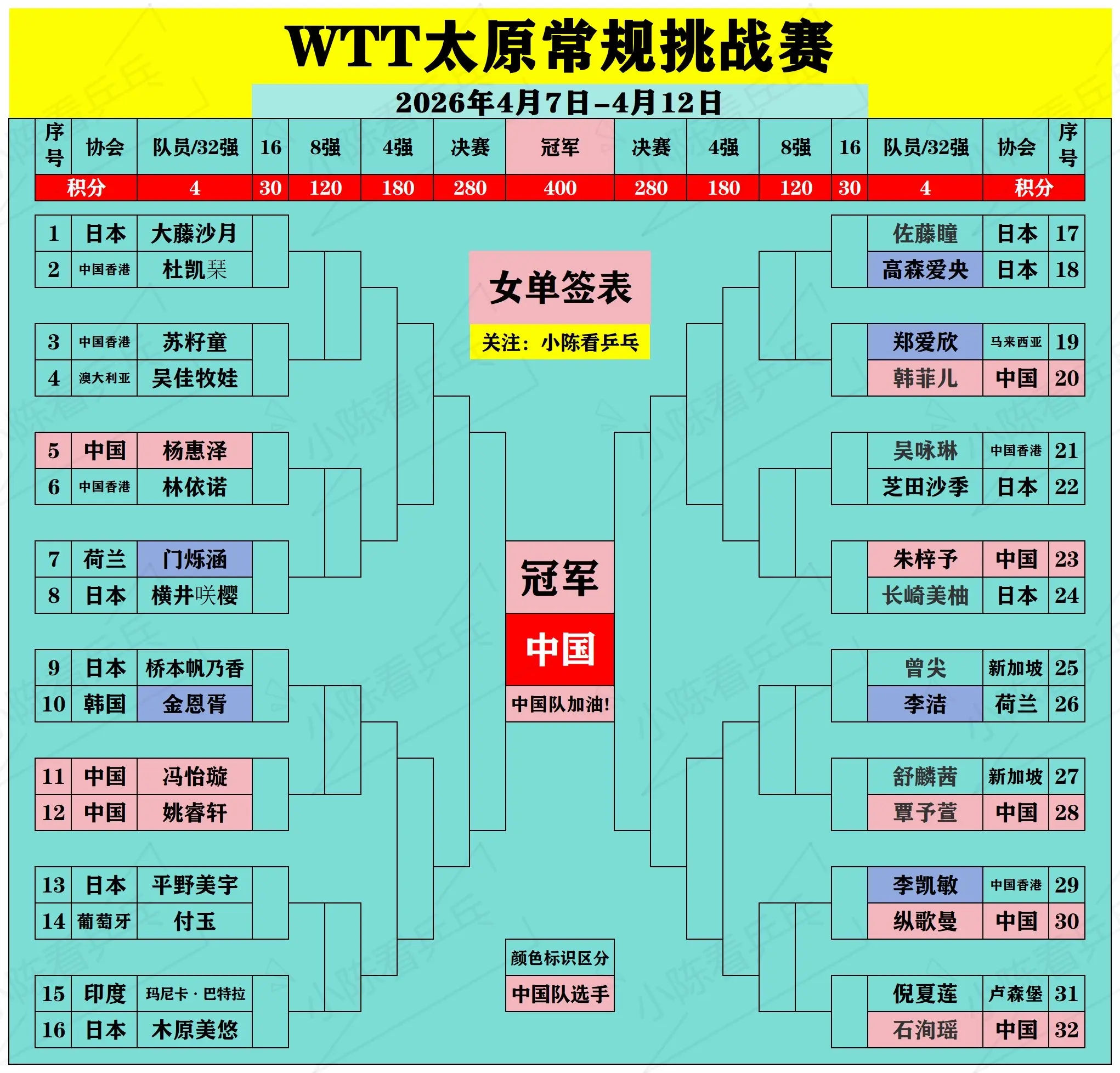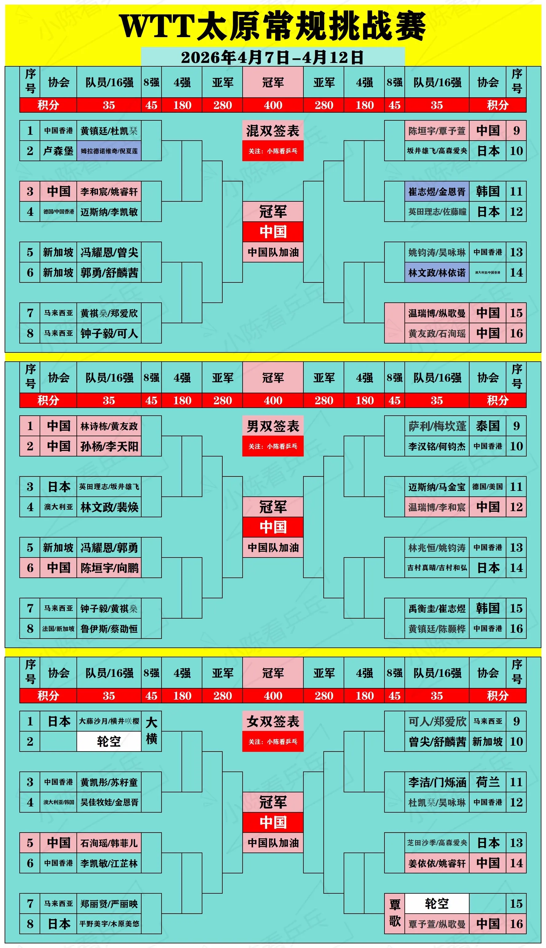 WTT常规挑战赛太原站正赛签位图。WTT常规挑战赛太原站正赛签位图,4月9日正赛开始,中国队加油。