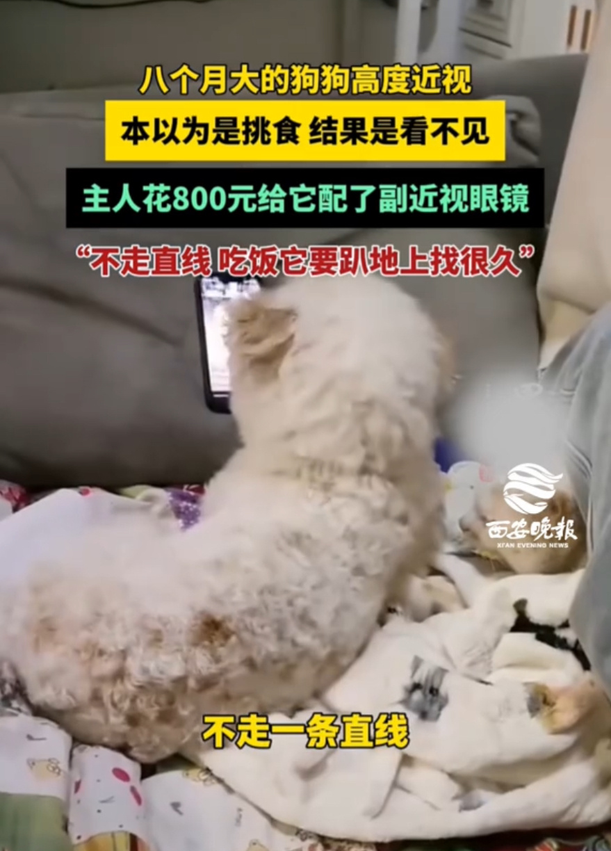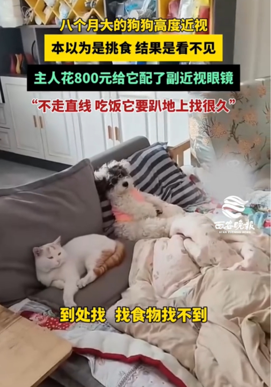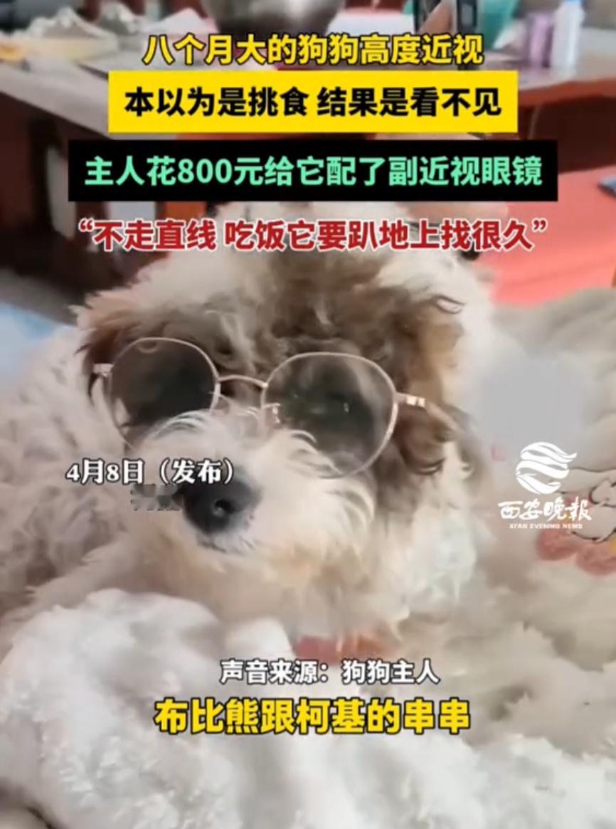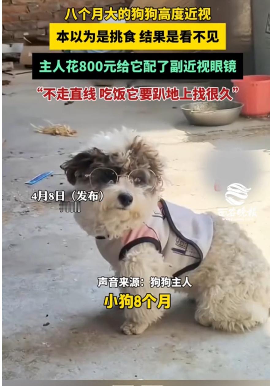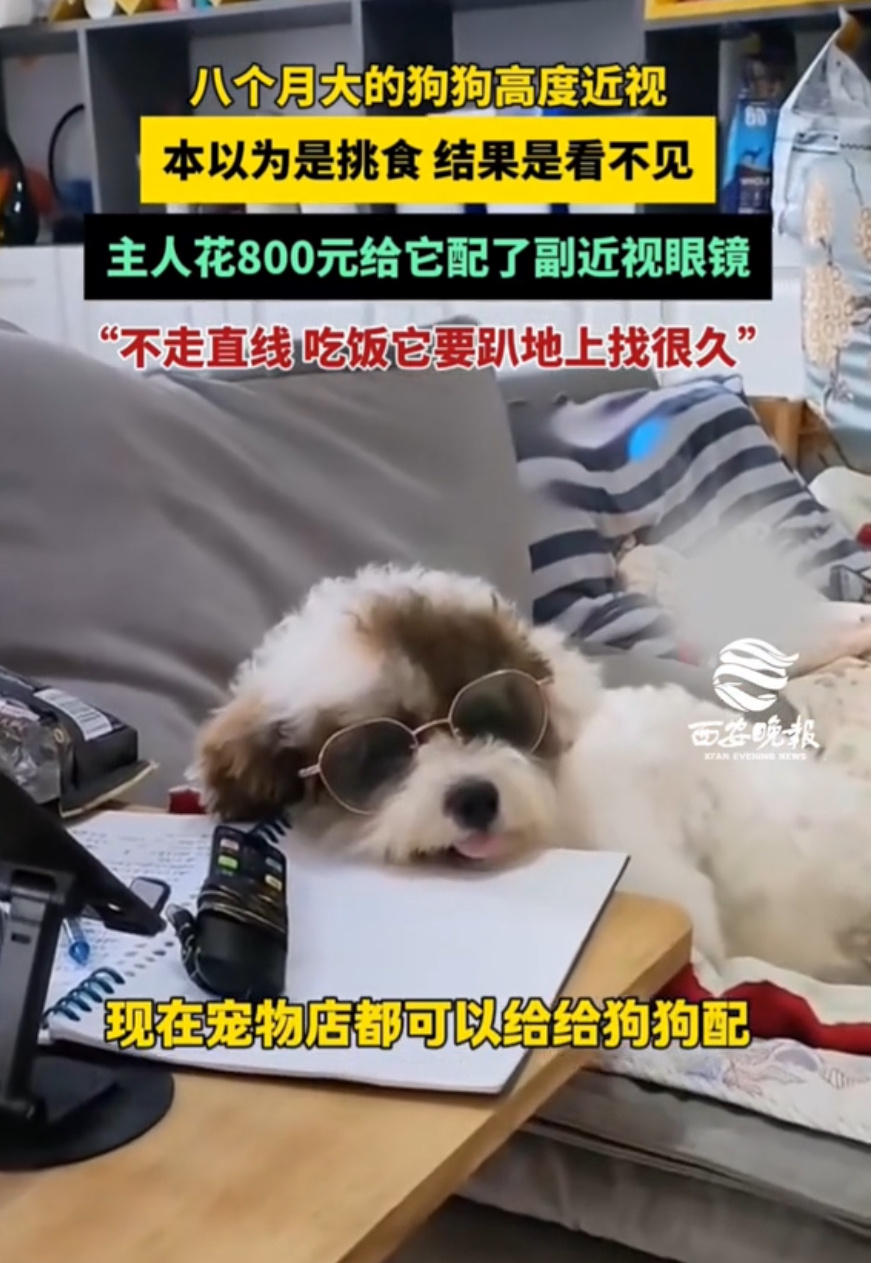 小狗近视主人花800元给定制眼镜河南一只8个月大的小狗,因为800度高度近视,总撞家具、认错主人,连饭盆都找不到,还被误会挑食!主人花800元给它定制专属眼镜,戴上后小家伙瞬间眼神清澈,摇着尾巴欢快探索,画面太治愈啦~这事不仅戳中萌点,还让大家知道狗狗也会近视,主人的用心更是狠狠戳中网友的心!小狗近视主人花800元给定制眼镜