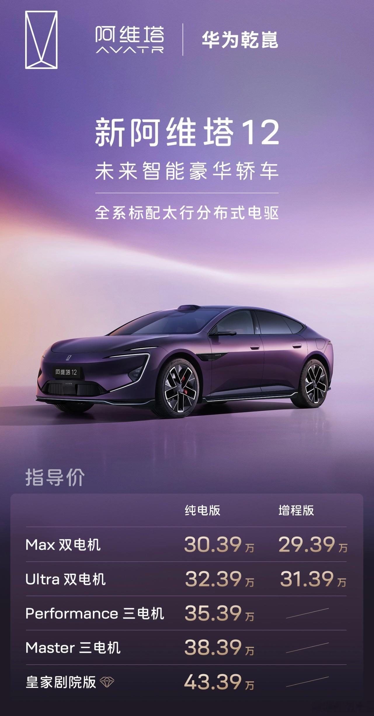 新阿维塔12上市,纯电/增程双动力7款车型,指导价29.39万元起,同时阿维塔0