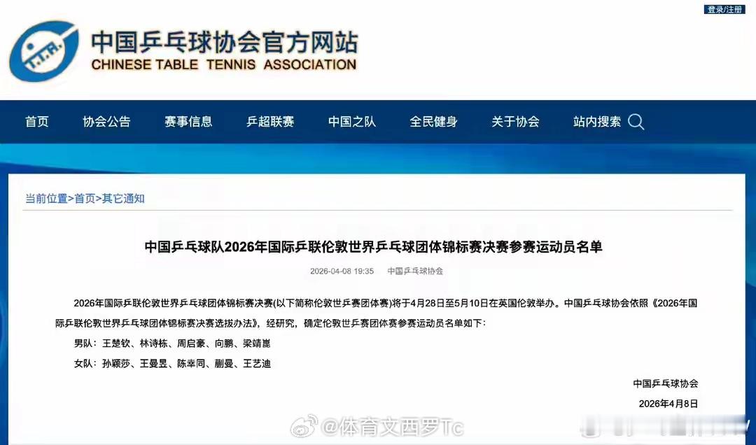 4月8日晚,中国兵协在官方发布消息,公布了出战今年伦敦世乒赛团体锦标赛决赛的参赛运动员名单。男队由新科世界杯冠军王楚钦领衔,此前受伤病困扰的林诗栋回归,女队则是孙颖莎和王曼昱两人联袂坐镇。