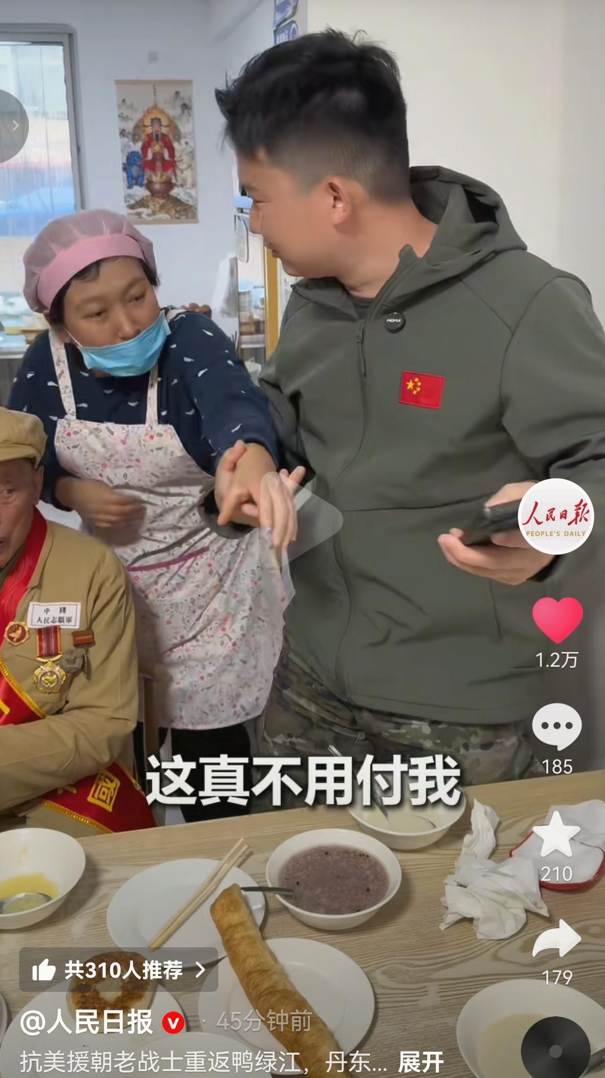 老板娘的话,直接让在场所有人都红了眼:“今天的幸福生活,都是这些老人家拿命换来的!我姥爷也当过兵,解放锦州的时候就参加了,也当过兵、打过很多仗!我太懂这份感情了!他们能来我这小店吃饭,是我的荣耀!别说一顿饭,就是天天来,我也管得起!我们也是为老人家的一份心意,这就是我们共同的心理!要是收了钱,我心里反而不得劲了!”