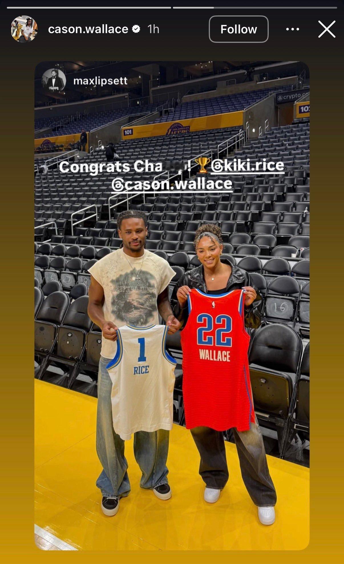 哈哈哈赛后卡森华莱士与女友kiki交换球衣!雷霆战胜湖人雷霆vs湖人雷霆