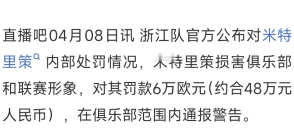 浙江俱乐部也给出追罚:米特里策损害俱乐部和联赛形象,罚6万欧,约48万,具体内容见图三!