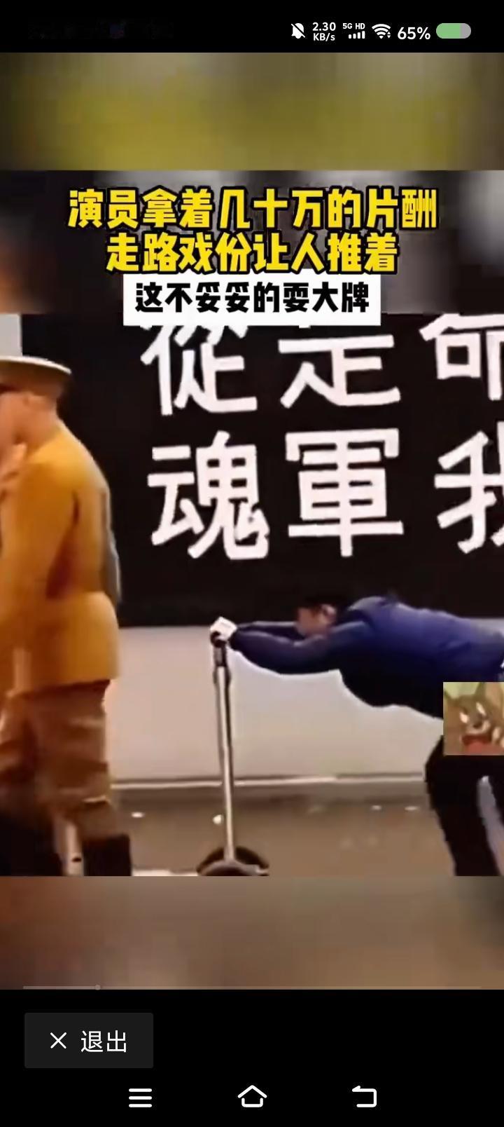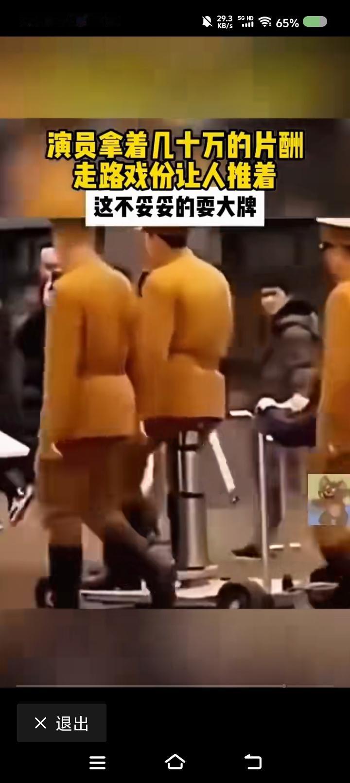 网上视频:拍戏中,有个演员站在小车上,摆动双臂,仿佛在走路。有人在推车。
