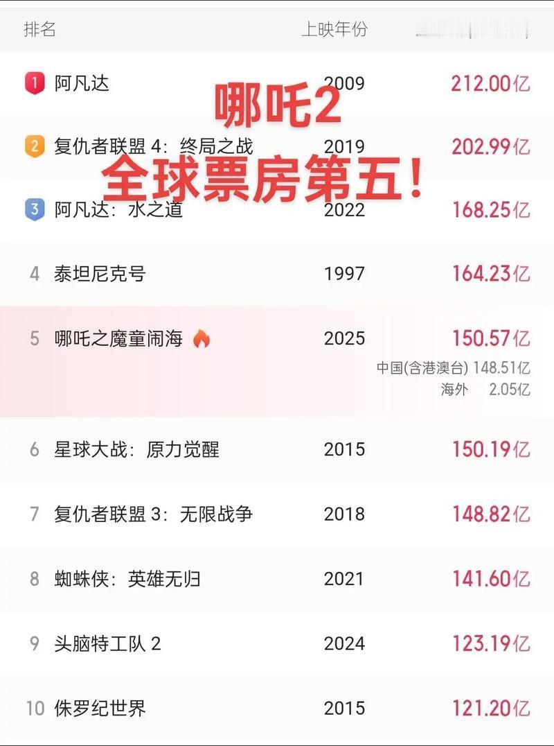 此次反超主要因东南亚票房补录。作为首部冲进全球前五的亚洲/非好莱坞电影 ,它打破百年垄断,标志国漫与中国电影的硬核实力正式站上世界顶端。2026年票房 哪吒2票房对比