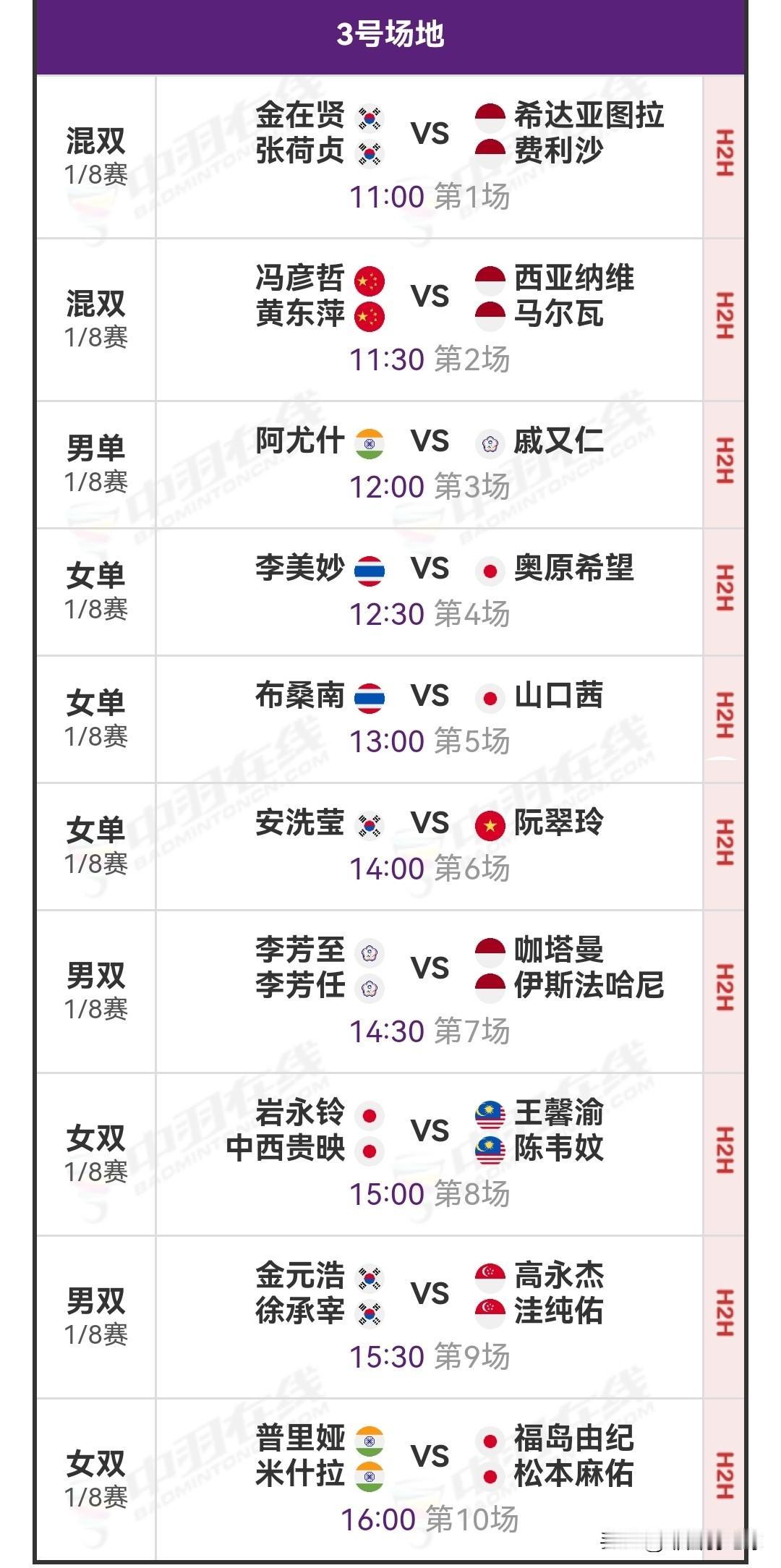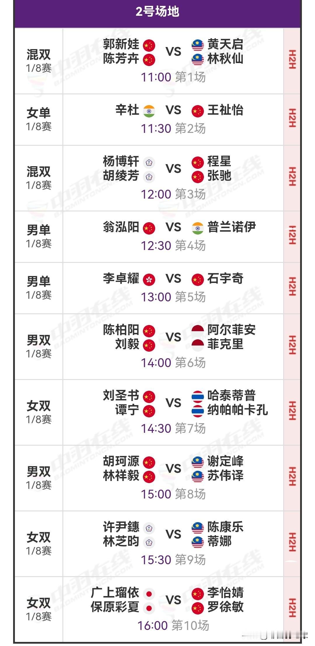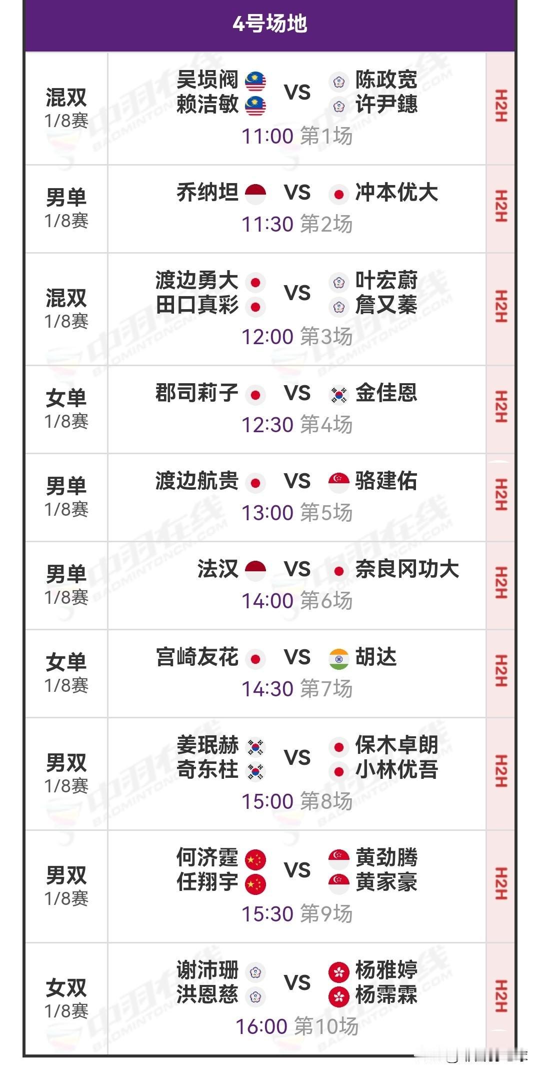 2026年4月9日亚洲羽毛球锦标赛1/8决赛安排