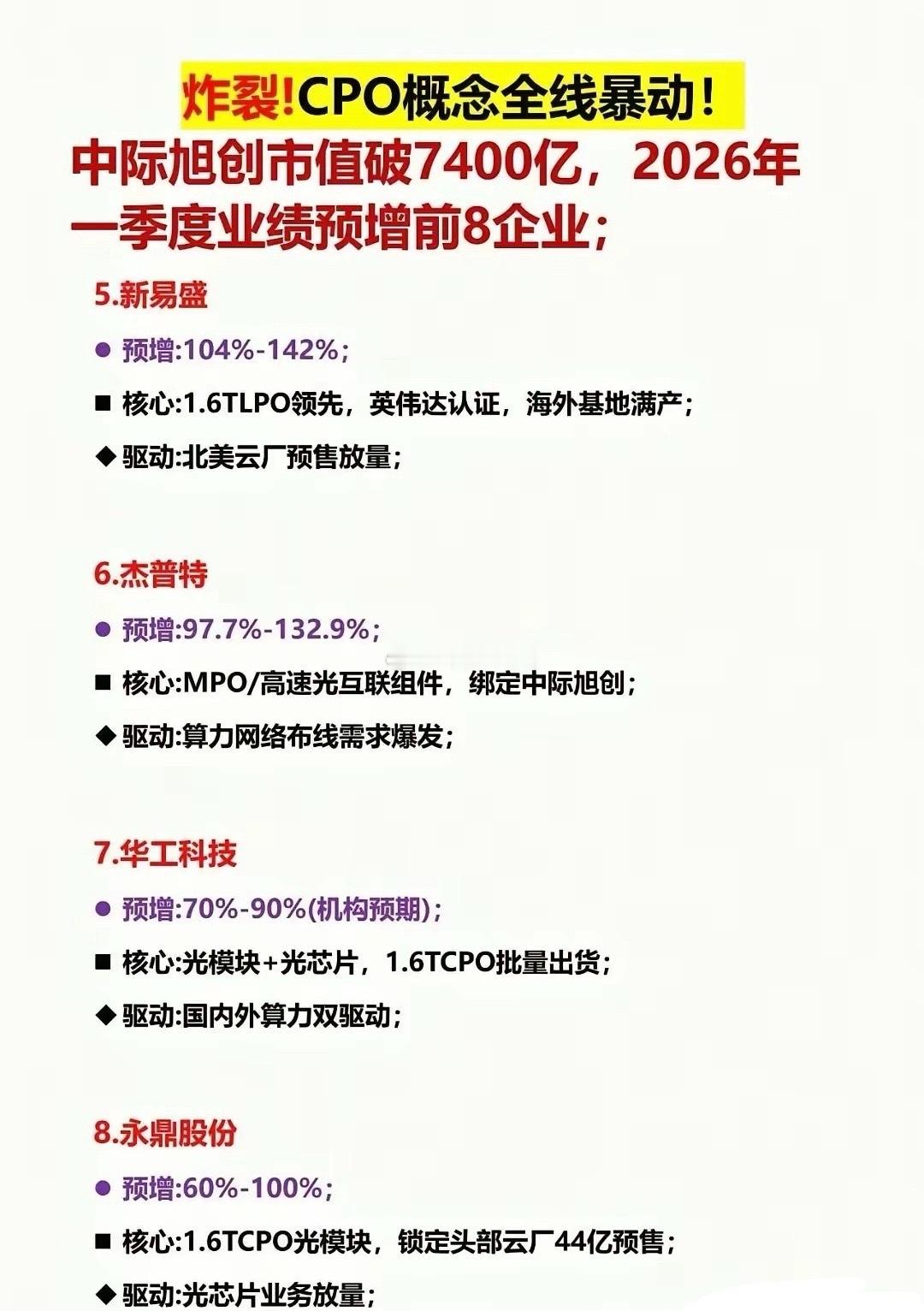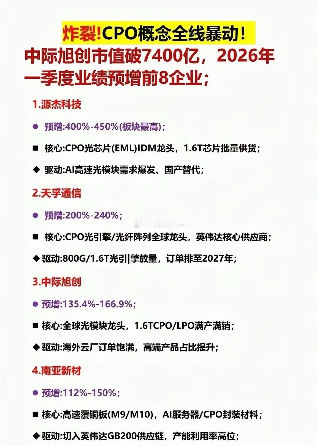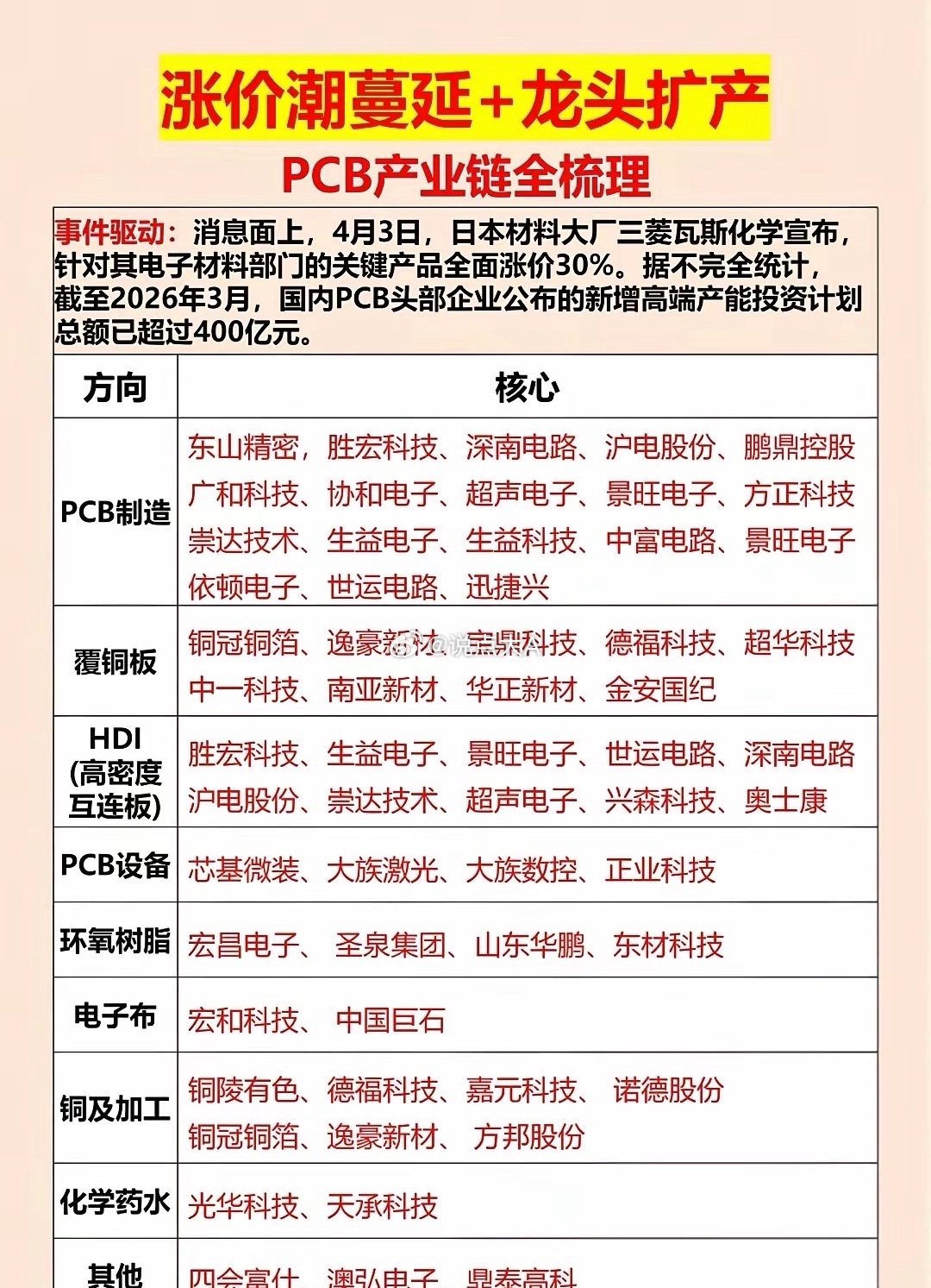 AI算力浪潮席卷全球,CPO与PCB两大算力核心赛道,业绩与逻辑双重共振,把握AI算力时代的核心投资机遇!CPO+PCB两大主线全梳理,核心标的一网打尽!PCB产业链迎来涨价潮+龙头扩产双重催化!日本三菱瓦斯化学宣布电子材料全面涨价30%,国内头部企业新增高端产能投资超400亿,AI服务器PCB成为行业最确定增长方向。胜宏科技作为全球AI服务器PCB绝对龙头,深度绑定英伟达;沪电股份、深南电路等高端PCB龙头持续突破,上游覆铜板、电子布、设备等环节同步受益,产业链全链条迎来爆发。风险提示:AI算力浪潮下,CPO、PCB两大主线持续火爆,股价与业绩双双冲高,当前板块内龙头股普遍处于历史估值高位,中际旭创、天孚通信等标的市盈率已远超行业平均水平,股价提前透支了未来2-3年的业绩增长预期。但越是狂欢时刻,越要绷紧风险这根弦!⚠️ 以上内容仅为风险提示,不构成任何投资建议,理财有风险,投资需谨慎。