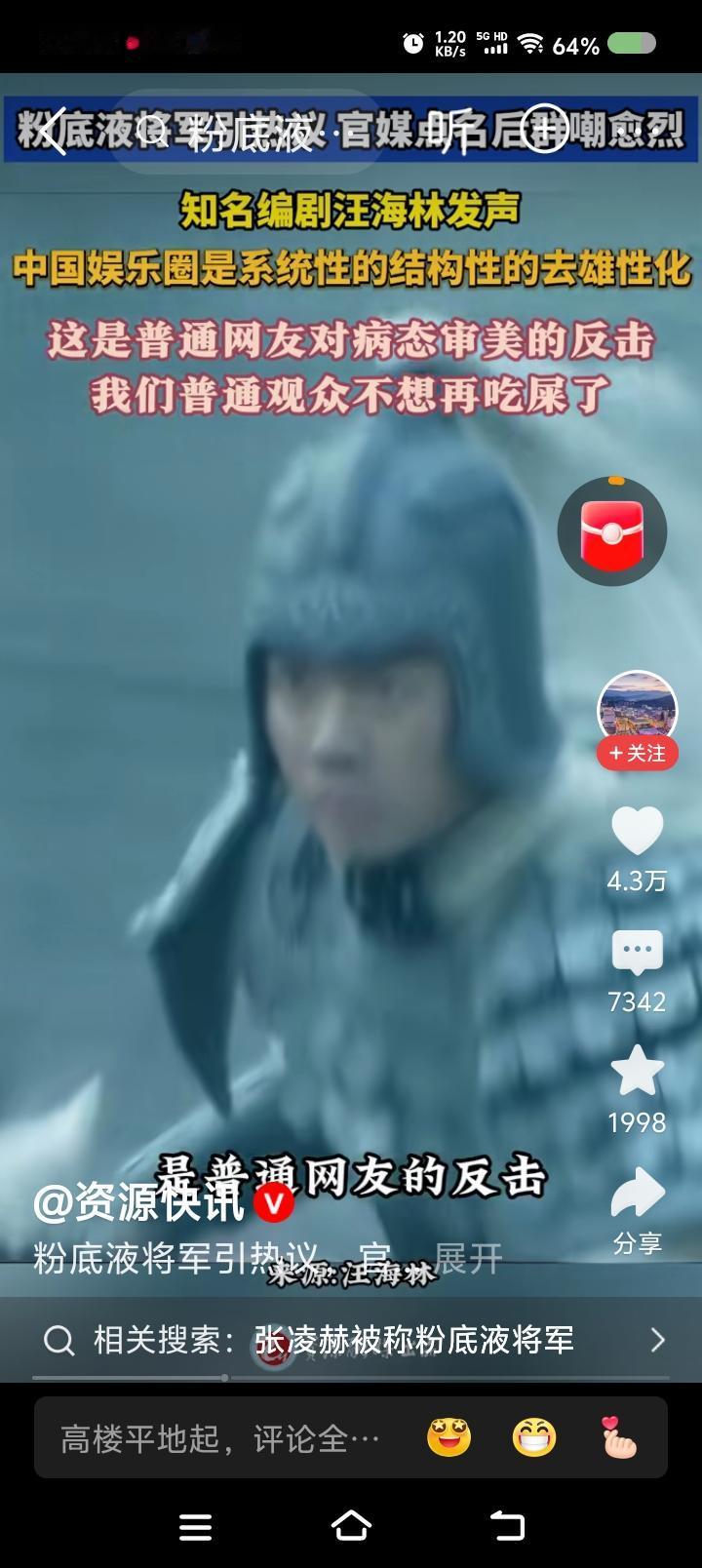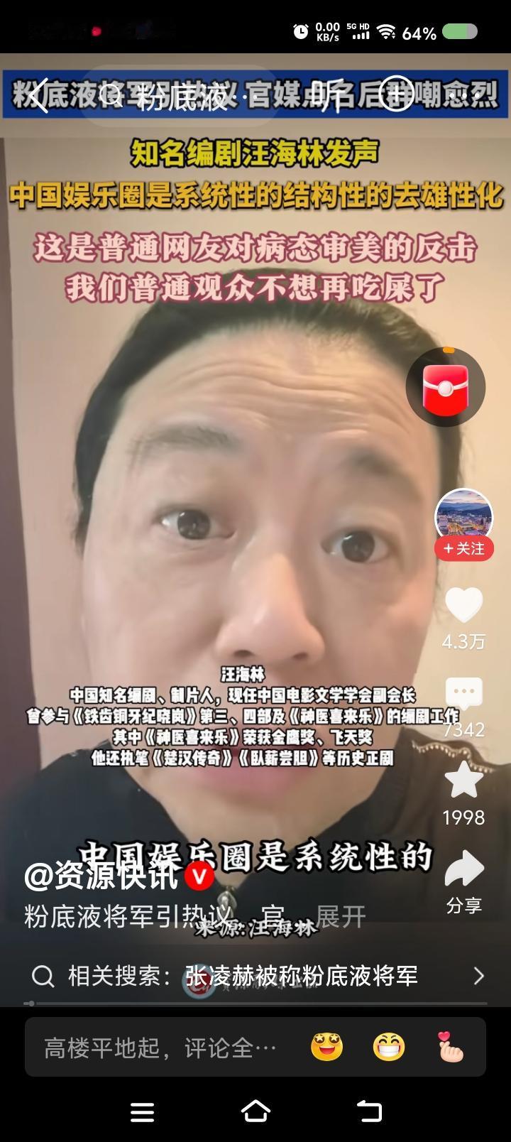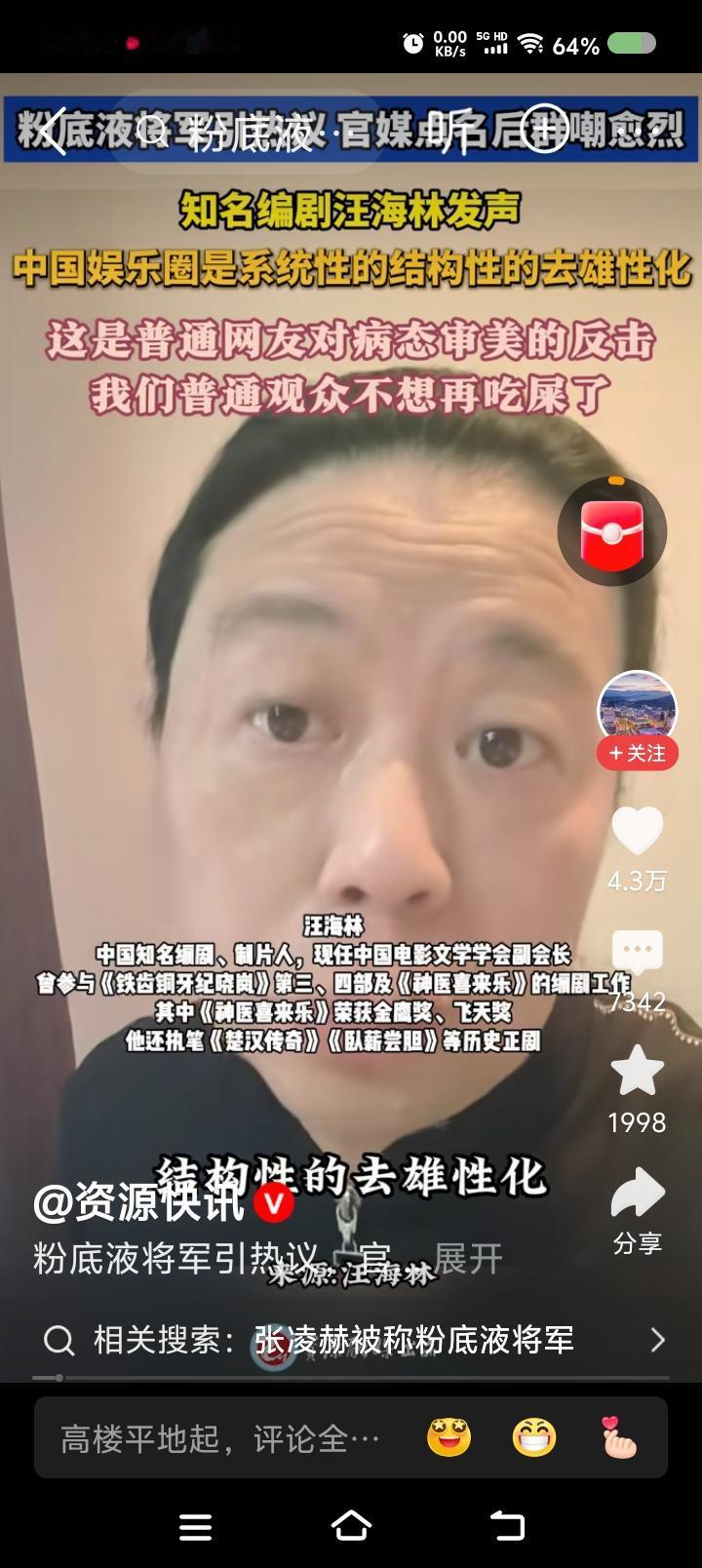 网上视频:汪海林认为,中国的娱乐圈在系统性地去雄性化,观众忍了十几年了,不想忍了。粉底液将军引争议,观众对病态审美开始反击……