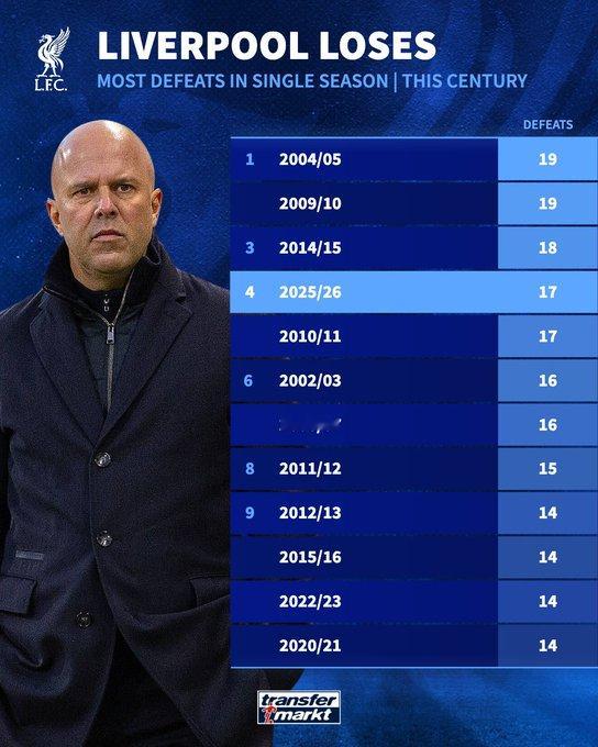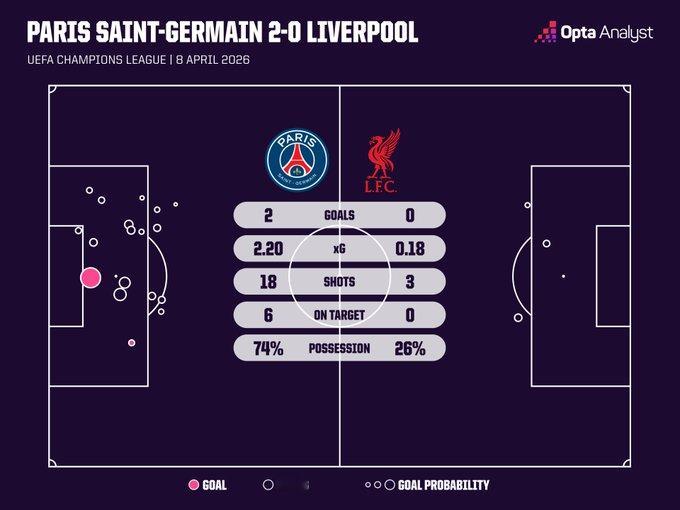 本赛季已是第三次在各项赛事遭遇三连败,这是自 1953-54 赛季从顶级联赛降级以来,首次在单季出现3次+三连败2012年4月以来首次客场四连败,也是本赛季欧冠8强战首回合唯一没有获胜的客队 今晚的预期进球值(xG)仅为0.17,这是斯洛特执教以来,所有赛事中创下的最低纪录。事实上,在斯洛特接手后的105场比赛里,xG最差的两场比赛,全是客场对巴黎,去年是0.27