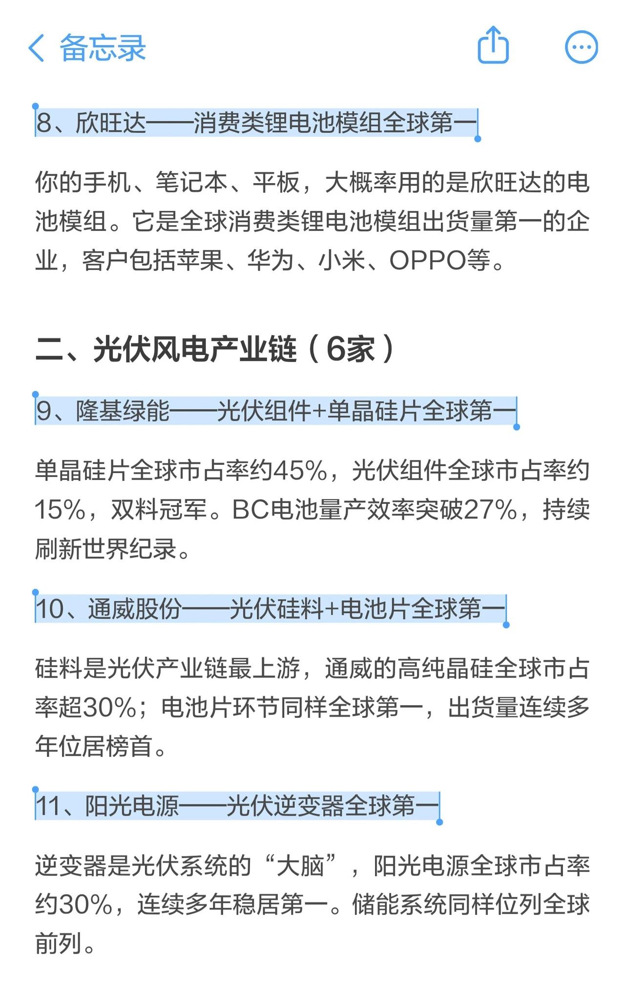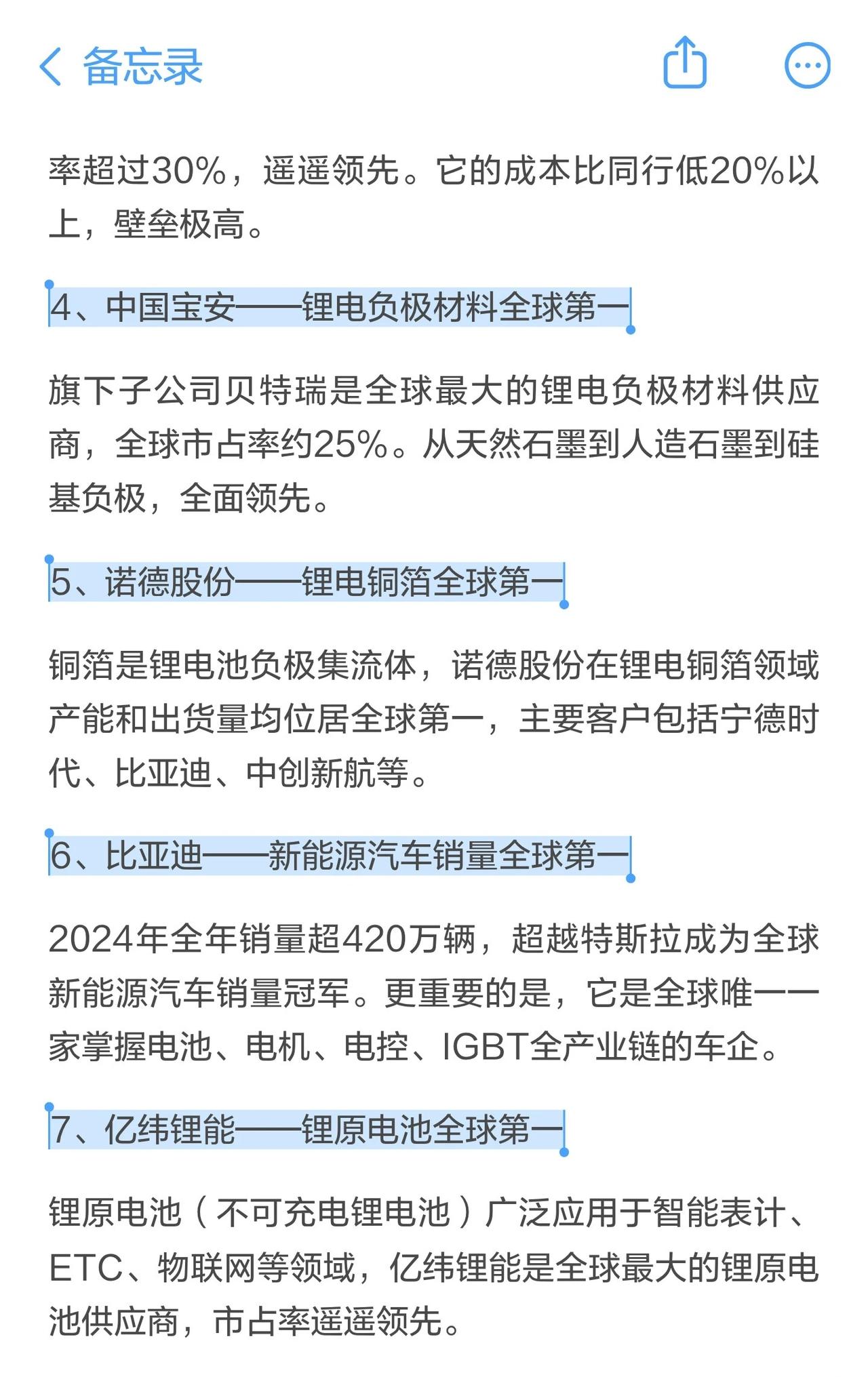 1. 新能源车产业链(8家):宁德时代(动力电池/储能电池)、天赐材料(锂电池电解液)、恩捷股份(锂电池隔膜)、中国宝安(锂电负极材料)、诺德股份(锂电铜箔)、比亚迪(新能源汽车销量)、亿纬锂能(锂原电池)、欣旺达(消费类锂电池模组),在各自细分领域市占率/产能/出货量全球领先,深度绑定头部客户或技术壁垒显著。