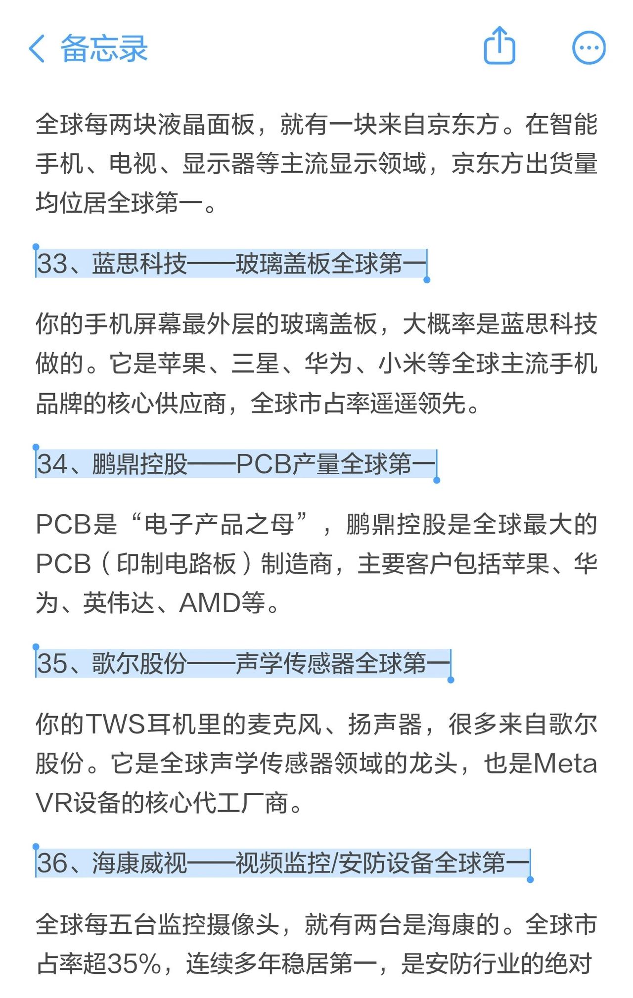 6. 消费电子/半导体(7家):立讯精密(AirPods组装/消费电子精密制造)、京东方A(液晶面板/显示屏出货)、蓝思科技(玻璃盖板)、鹏鼎控股(PCB产量)、歌尔股份(声学传感器)、海康威视(视频监控/安防设备)、美的集团(白色家电出货量),在消费电子制造、显示面板、玻璃盖板、PCB、声学、安防、白色家电等领域全球出货量/市占率第一,深度服务全球主流品牌。